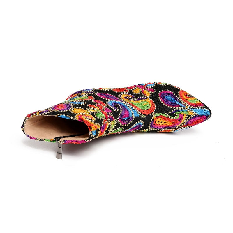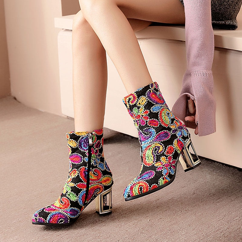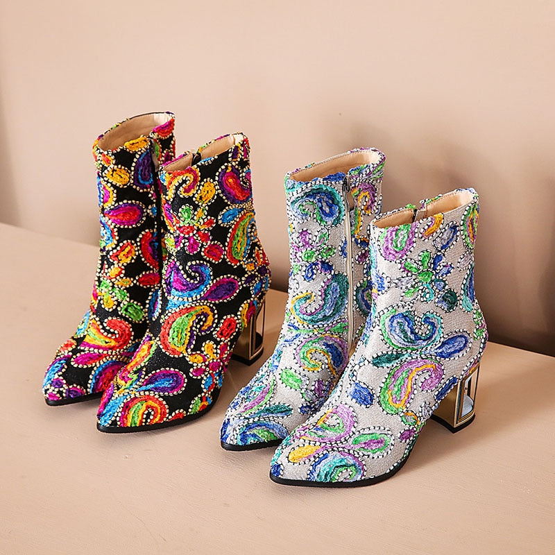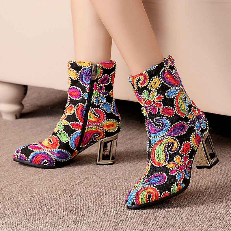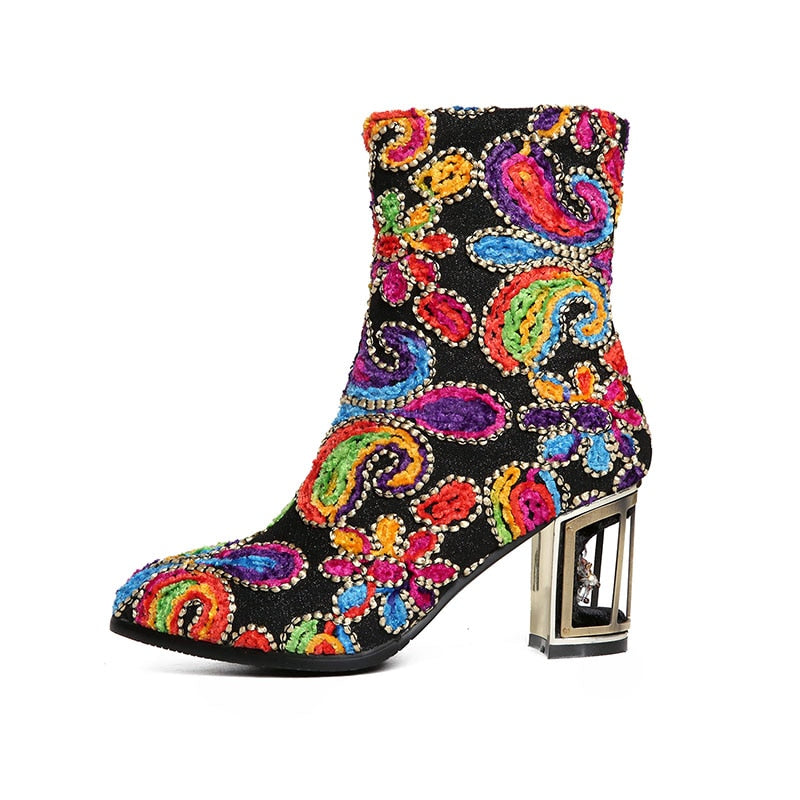 Colorful Flower Mid-Calf Boots with Synthetic Material, Fretwork Heel, Pointed Toe, and Zip Closure