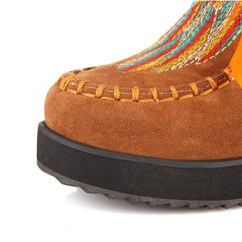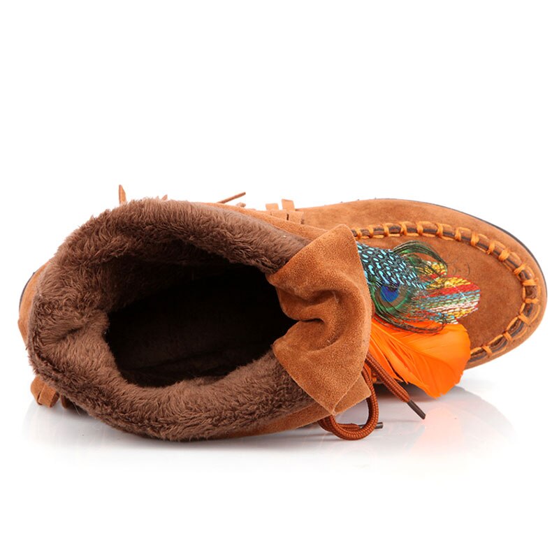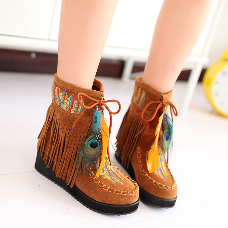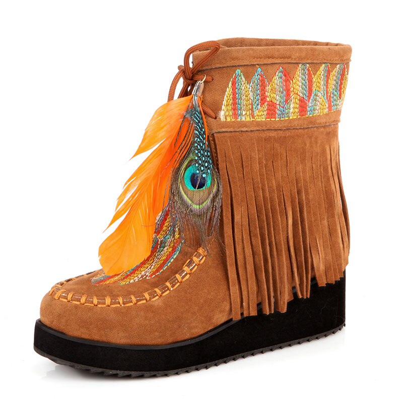 <transcy>Botines de tacones de cuña con decoración de plumas de flocado indio</transcy>