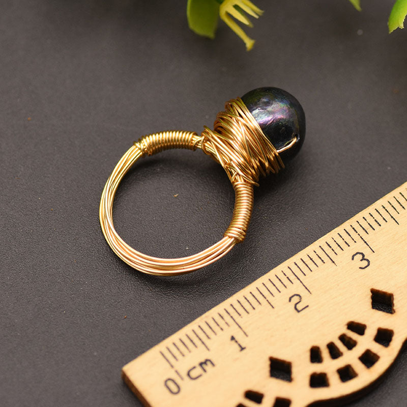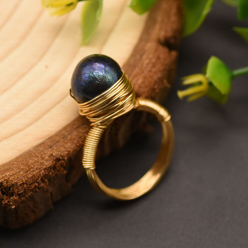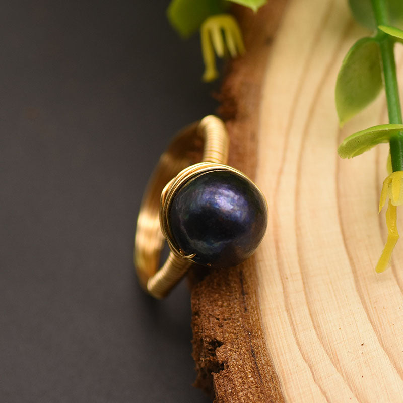 Anillo de cobre chapado en oro de 18k con perla de agua dulce barroca negra y diseño de bobina único