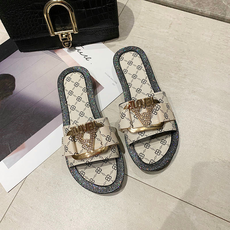 Designed to keep feet comfortable, these casual PU slippers are a practical choice for everyday wear. A metal letter detail provides a stylish finishing touch that is sure to turn heads. A cool geometric pattern keeps this pair of slippers looking contemporary. Wear these casual slippers for a cute summer-style option. Wear them with jeans, shorts, or dresses.