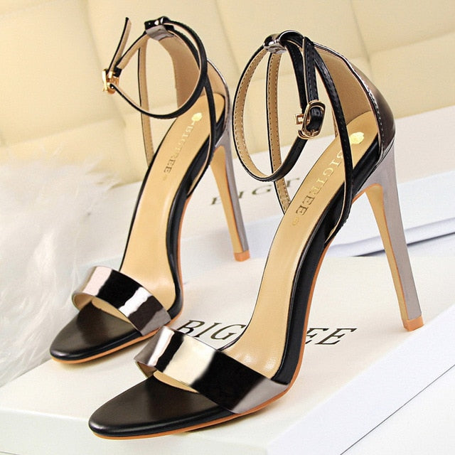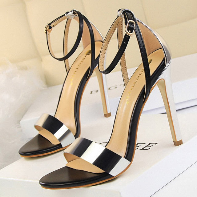 Sandalias de tacón con correa de hebilla en el tobillo con punta abierta y material de PU