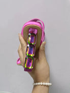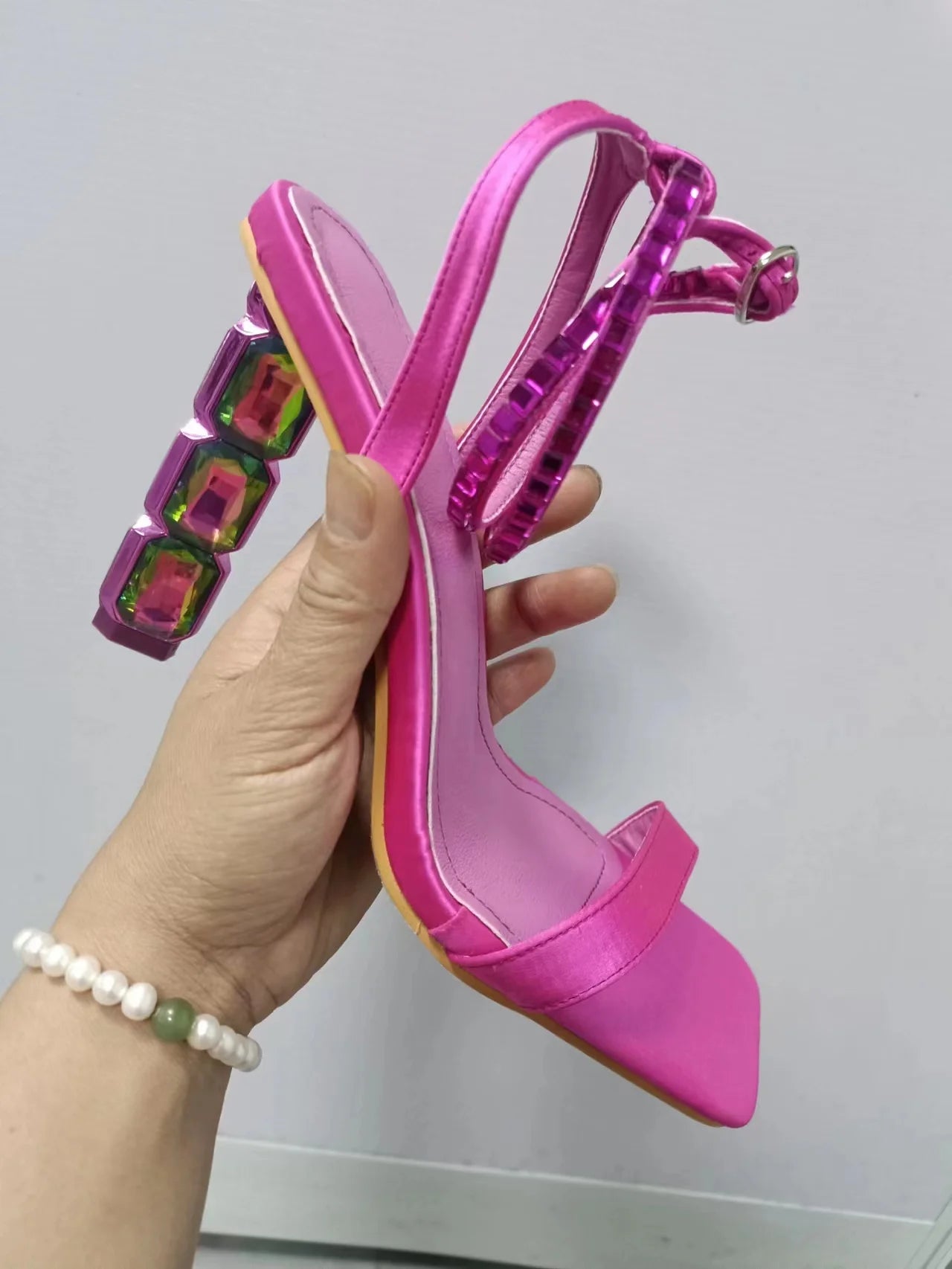 Elevate your style with our Delicate Prism Pump Sandals. These stunning heels feature a chic ankle strap and easy-to-use buckle closure. And with shimmering rhinestones, they add a touch of elegance to any outfit. Make a statement and step out in confidence!