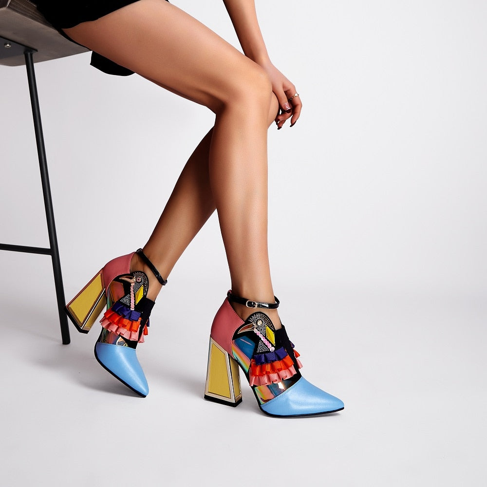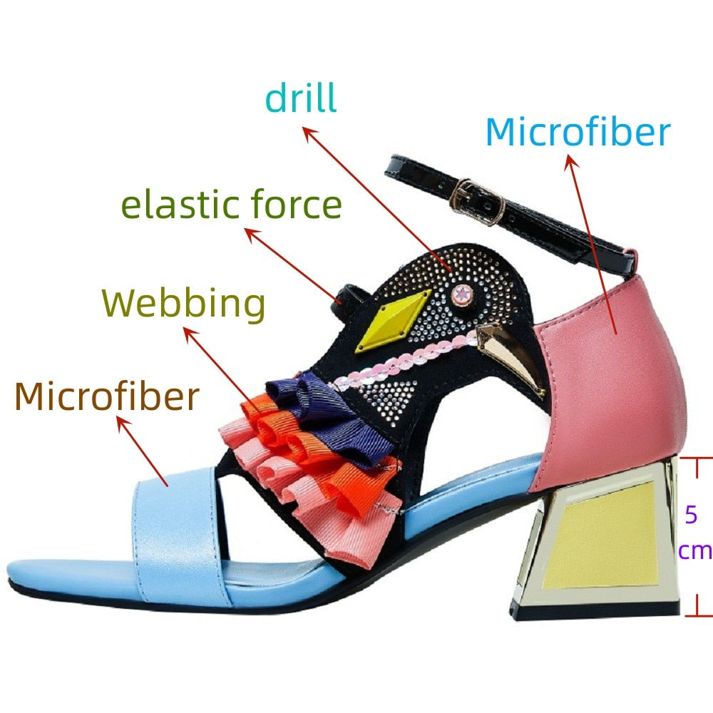 The Time Traveler Chunky Heels Sandals make a statement, with a colorful sequin and ruffle design that stands out. The mid-height chunky heel ensures stability and comfort, allowing you to wear them all day. A must-have for any fashionista!