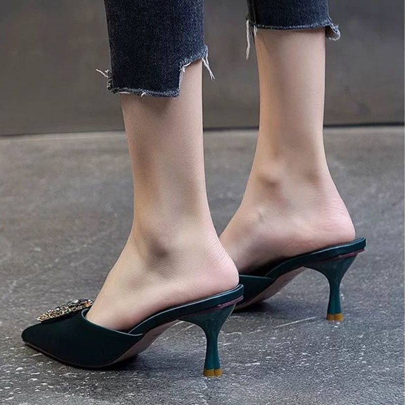You'll feel like a goddess in these sophisticated, yet comfy pump mules. The silk material hugs your feet, with a pointed toe and thin heels. The metal appliques on the front of the shoe are the perfect detail to complete the look.