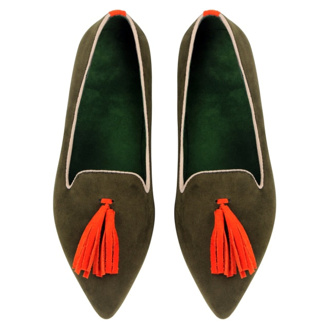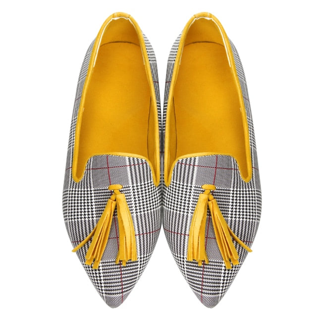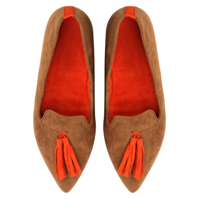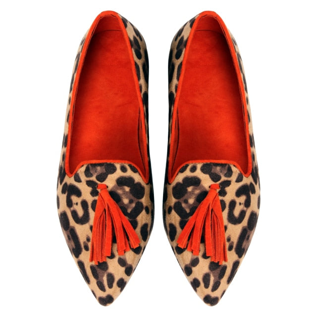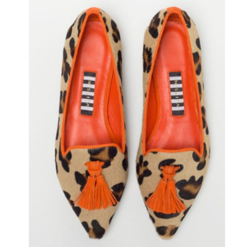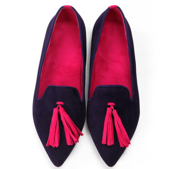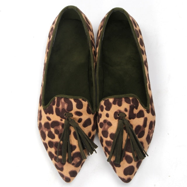 These slip-on flat shoes are perfect for daily use. It is available in various patterns. Features a tassel decoration, make it look fun and cute. The slip-on closure and pointed toe give it a classic look while the PU material gives it a soft and comfortable when you wear them.