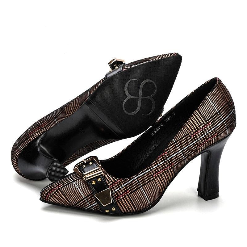 These pumps are perfect for any day of the week, whether you're going for a casual look or a more dressy one. The pumps are made of a quality material that will keep your feet comfortable throughout the day. The full plaid pattern also gives off a classic vibe that keeps you in an everlasting style.