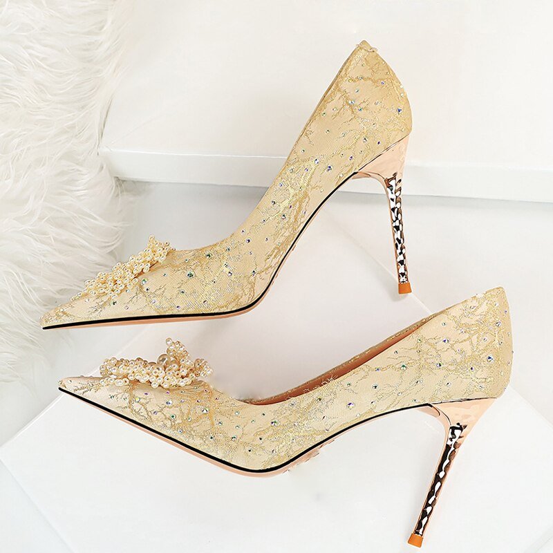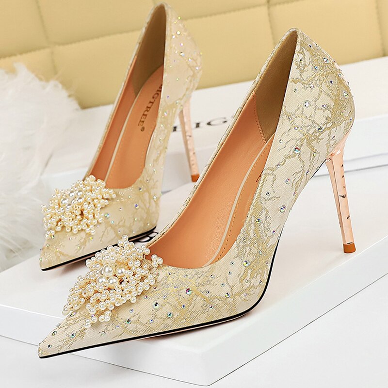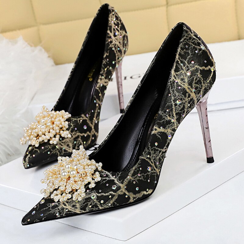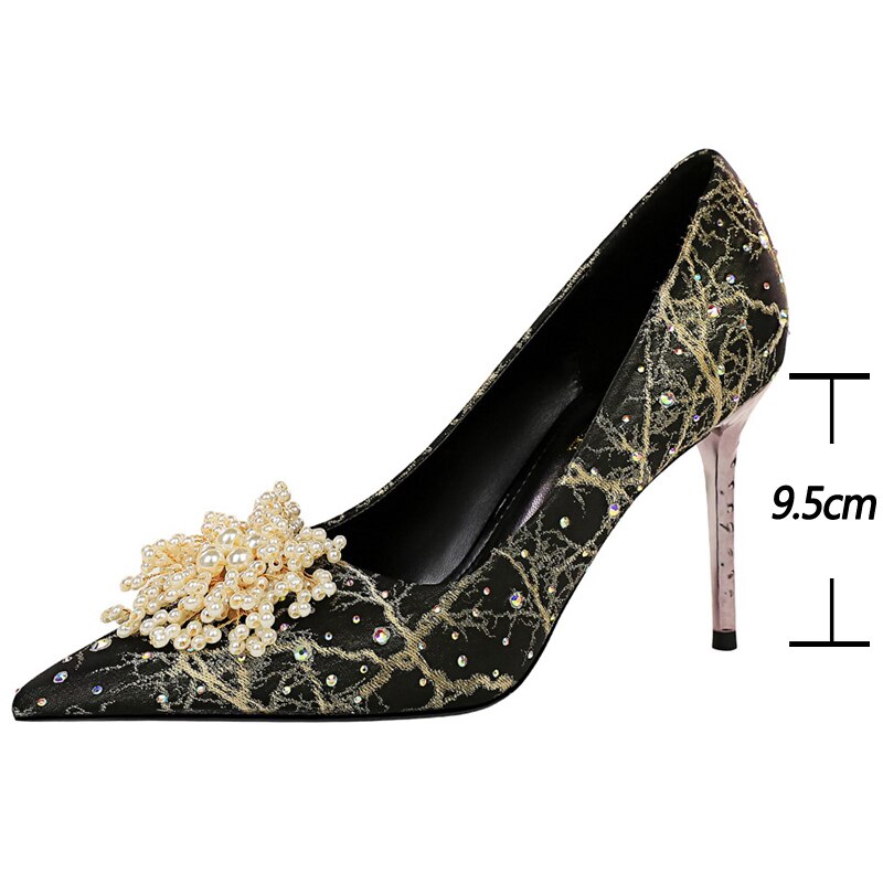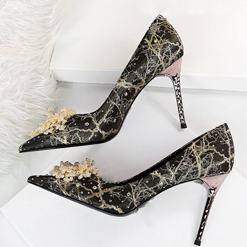 The new and improved women's stiletto shoes are here! These shoes have a pointed toe, PU material, geometric pattern, and beads decoration. These shoes are made with super high heels. These shoes are perfect for your special occasion.'