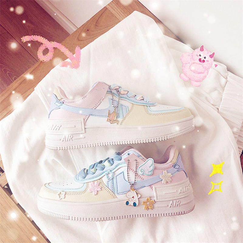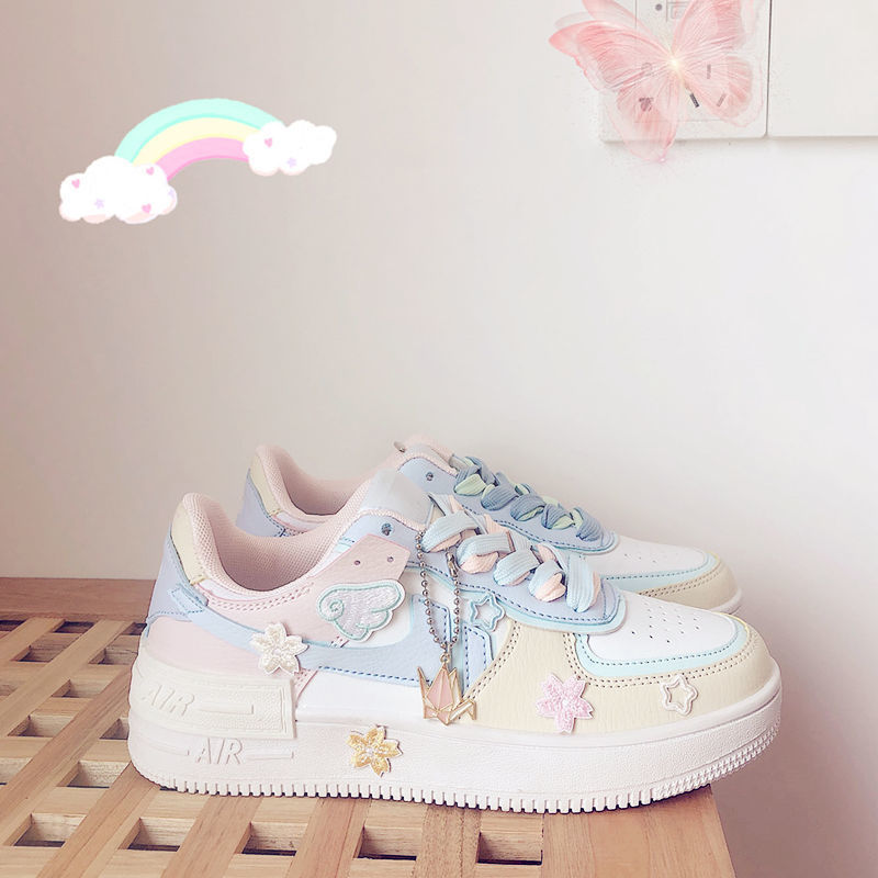 Add a little flair to your outfit with these electric, eye-catching, vibrant pastel rainbow sneakers. The upper is made of durable PU leather, the lining is made of cotton, and the insole is made of fabric. The thick rubber sole gives the shoe both style and traction function.