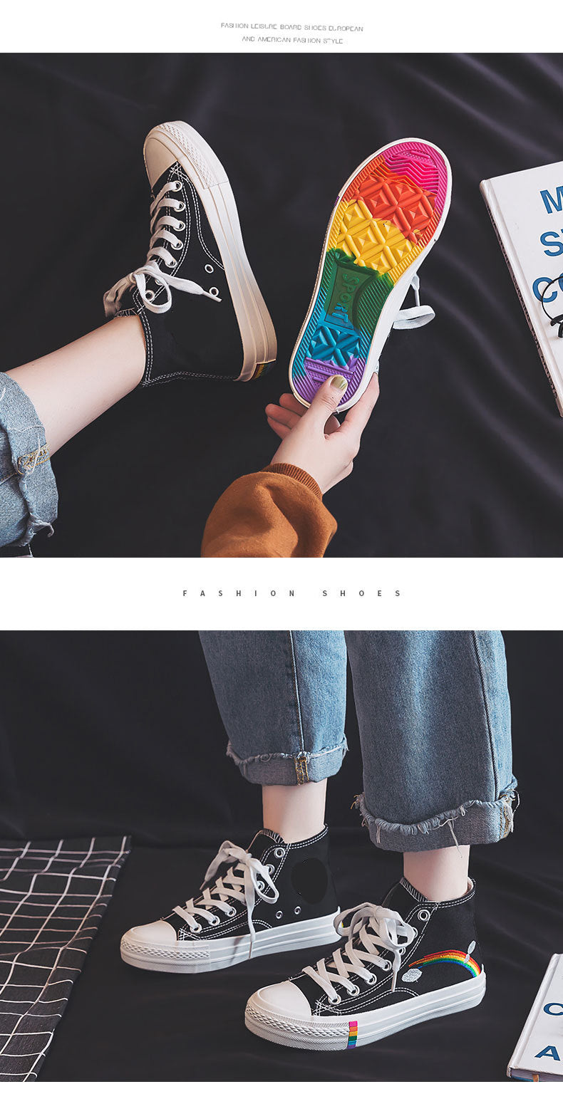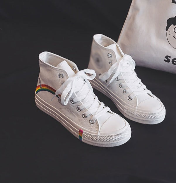 These high-top canvas sneakers have captured the essence of freedom and rebellion. The rainbow print and sole bottoms design is a fun and creative way to show off your personality.