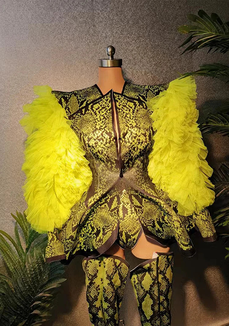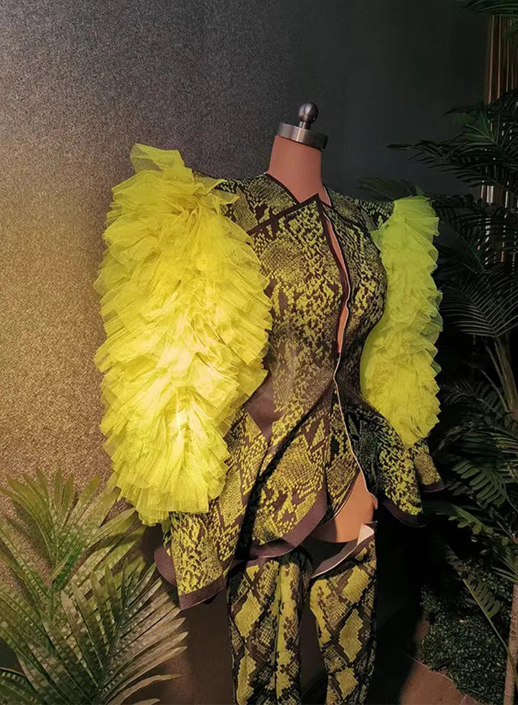 Get ready to shine in our A Sparkling Night Bodysuit. Made with a comfortable blend of polyester and spandex, this bodysuit features a stylish snakeskin pattern and playful ruffle details. The V-neckline adds a touch of elegance and will make you stand out on any night out. Get your sparkle on!
