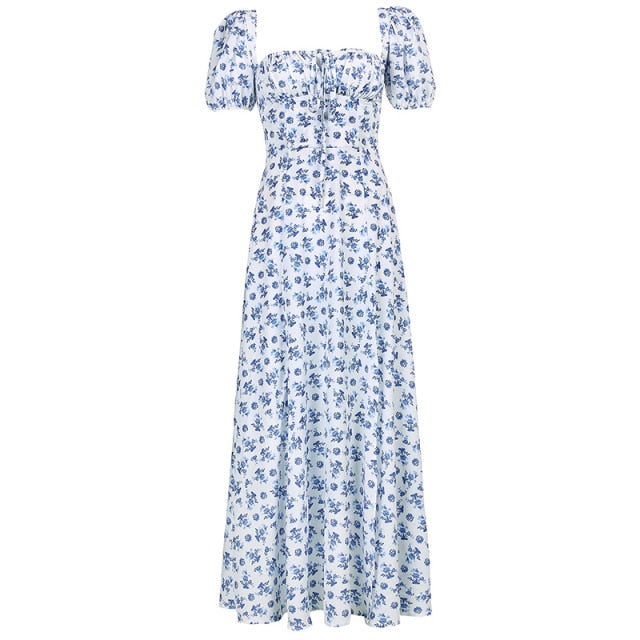 Vestido largo con estampado floral, corte en A y decoración fruncida