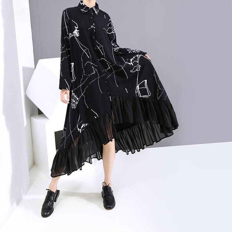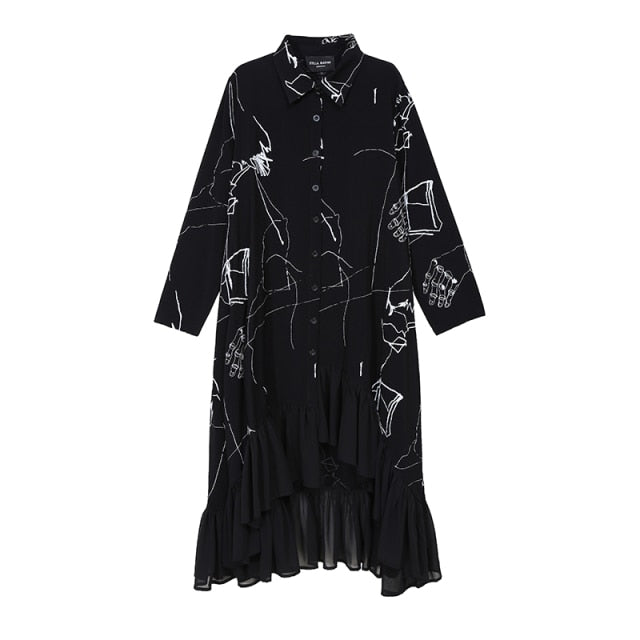 Vestido midi con cuello vuelto con estampado abstracto, manga larga, corte en A y material de rayón de algodón