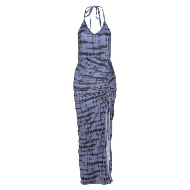 Vestido maxi de spandex de poliéster sin mangas con estampado Tie-Dye con abertura larga y fruncido