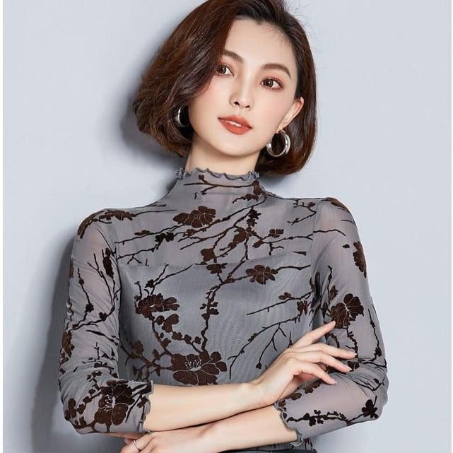 Blusa de malla de cuello alto de manga larga con estampado de flores y material de poliéster