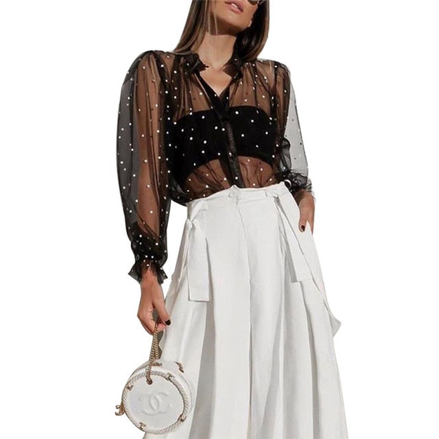 <transcy>Blusa de mujer de manga abullonada grande con botones sueltos transparentes de lunares retro</transcy>