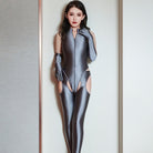 This set includes a bodysuit, pants, and gloves. The bodysuit comes in a sleeveless style with front zipper closure. The pant has hollow-out and low waist style and the gloves will complete your look.