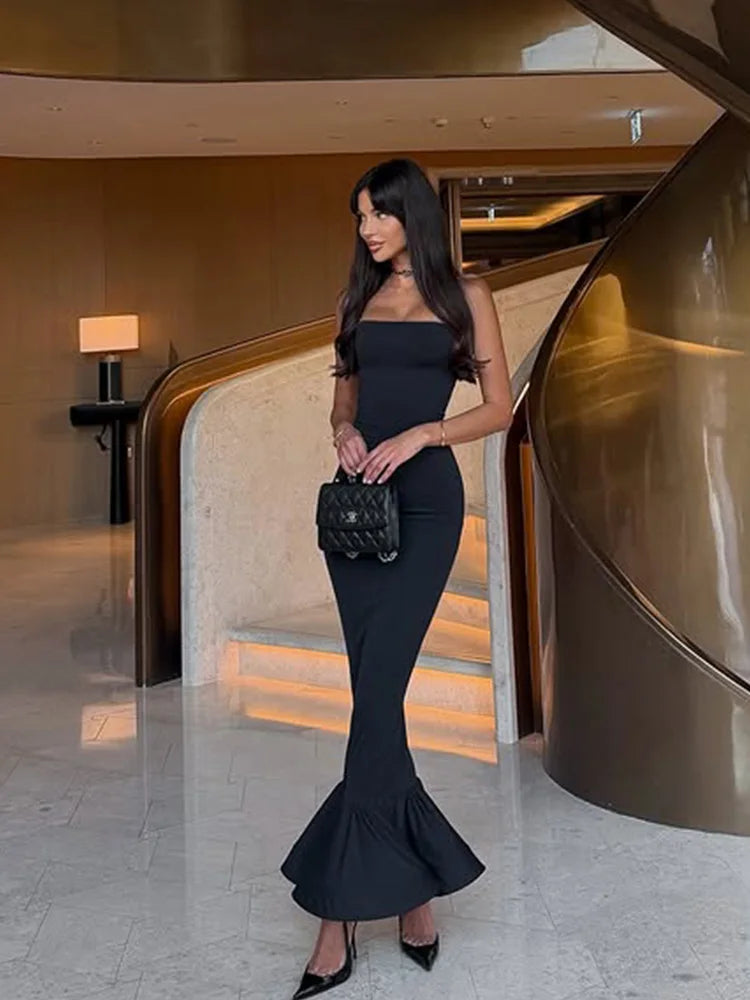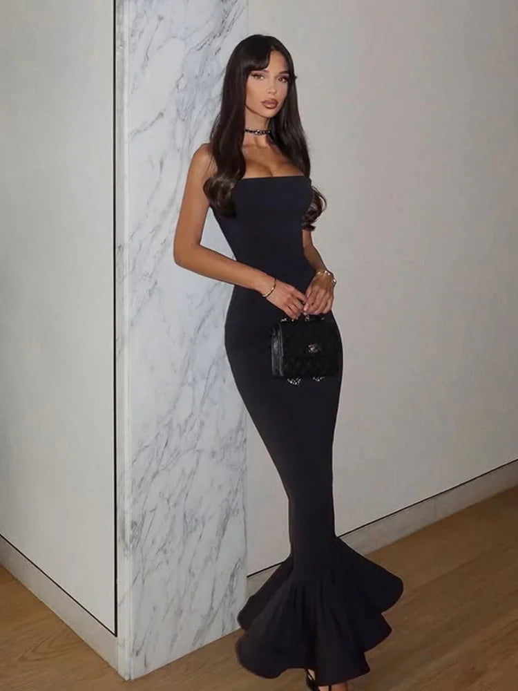 Elegant black strapless mermaid maxi dress designed to turn heads. The fitted bodice flows into a dramatic fishtail silhouette that hugs your curves before flaring at the hem. Perfect for formal events, galas, or special occasions where you want to make a sophisticated statement. The strapless neckline offers a timeless, glamorous look that flatters all body types.