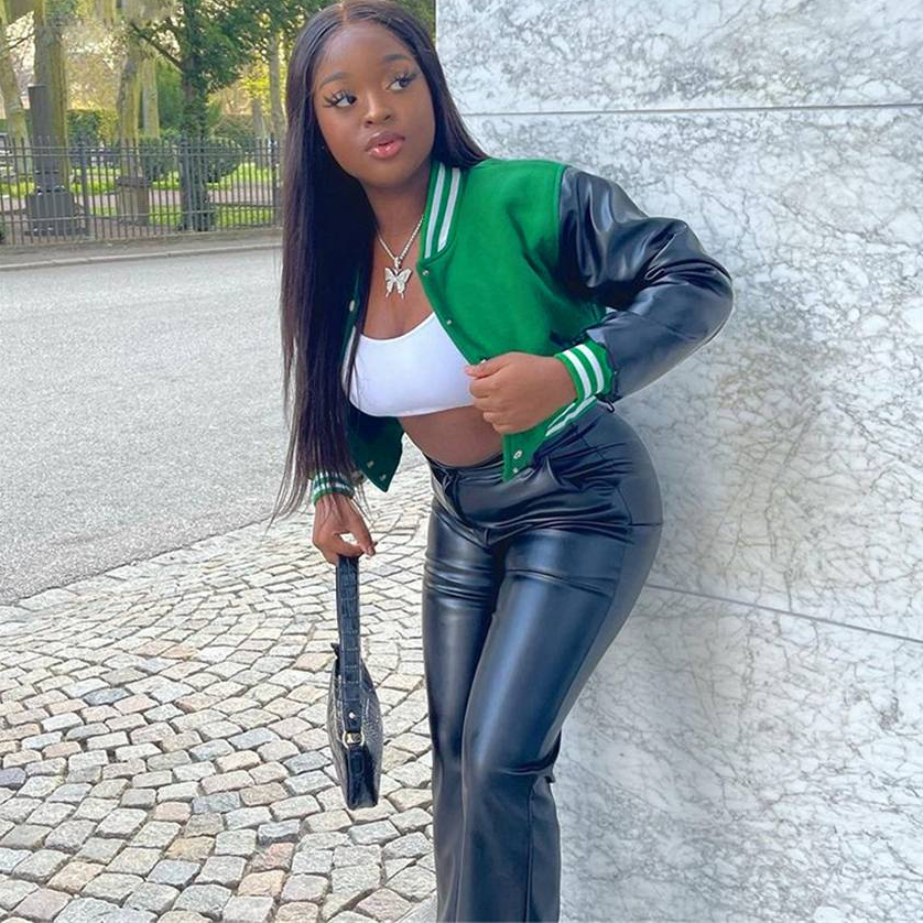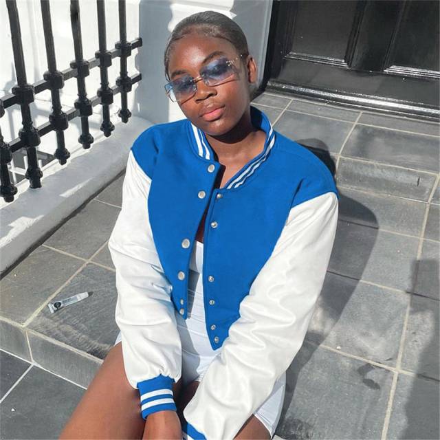 This crop bomber jacket is a great addition to any wardrobe. The two contrasting color options give this jacket a look that is fun and stylish. A simple but stylish button-up style. The polyester and spandex material keeps this jacket lightweight and breathable.