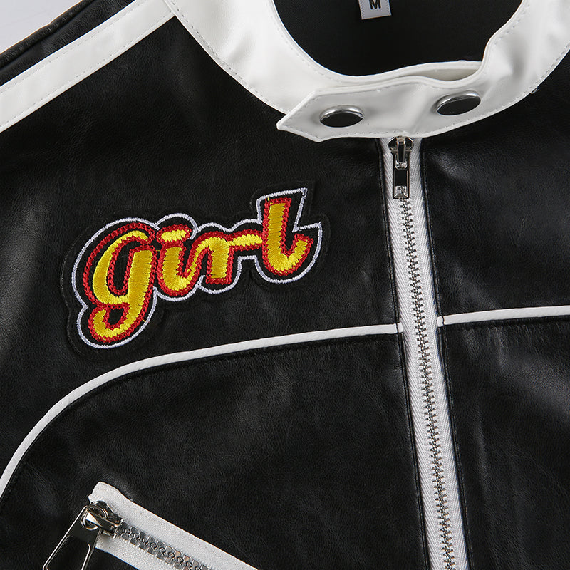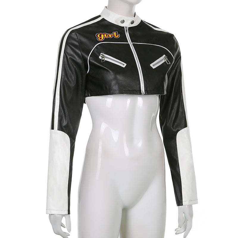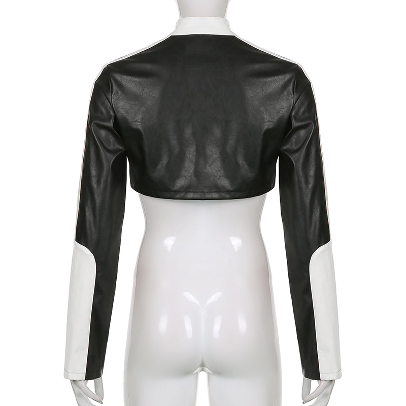 This Women's Cropped Jacket is made of polyester and has long sleeves. It has a zipper that goes from the top to the bottom of the jacket. The color is black.