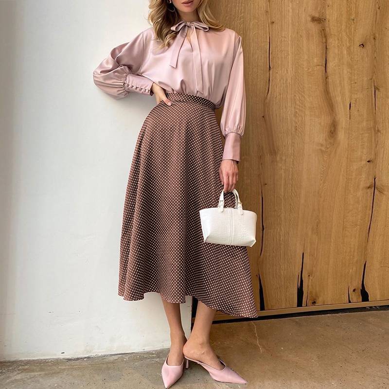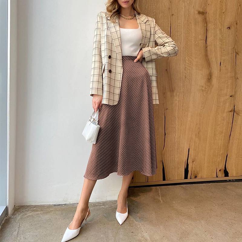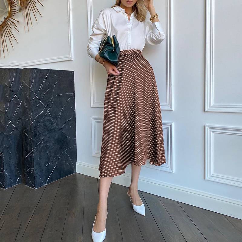 Falda evasé a media pierna con estampado de lunares de poliéster