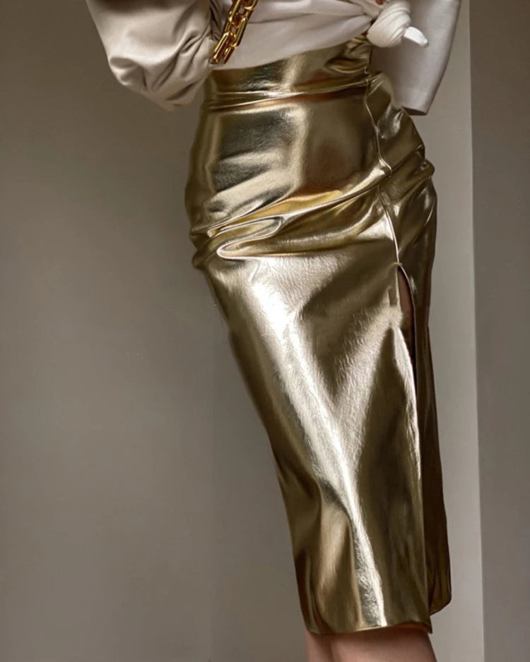 Make a bold statement with the Twilight Kissed Elegance Midi Skirt, crafted from sleek faux leather that catches the eye and commands attention. Its solid pattern sharpens your silhouette, perfect for daring nights where style meets edge. Elevate your wardrobe with a skirt that exudes confidence and fearless sophistication.