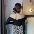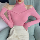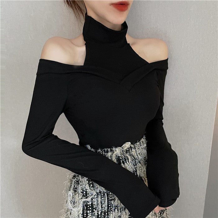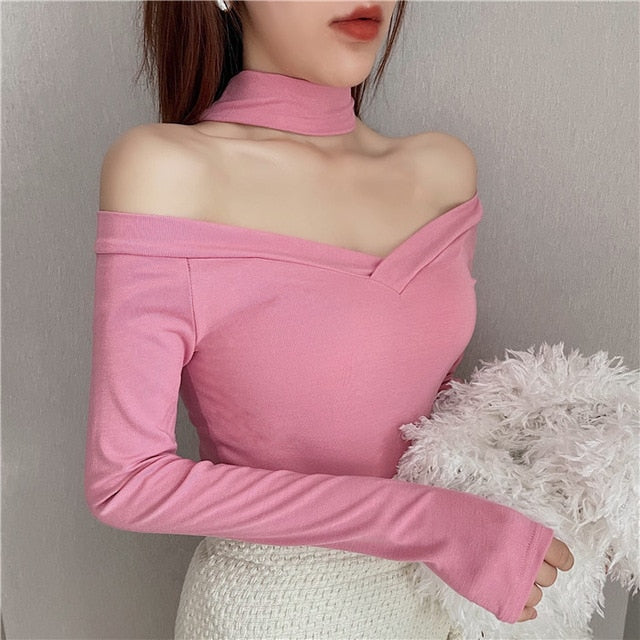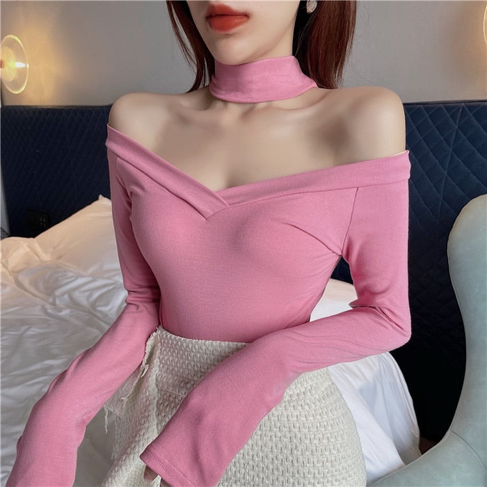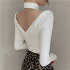 Camiseta lisa con cuello halter y manga larga y material de algodón y poliéster
