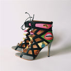 Colorful Front Lace-Up Stiletto with Applique Decoration and Zipper Closure