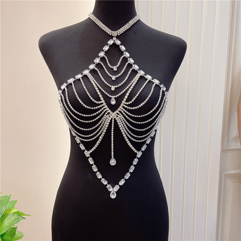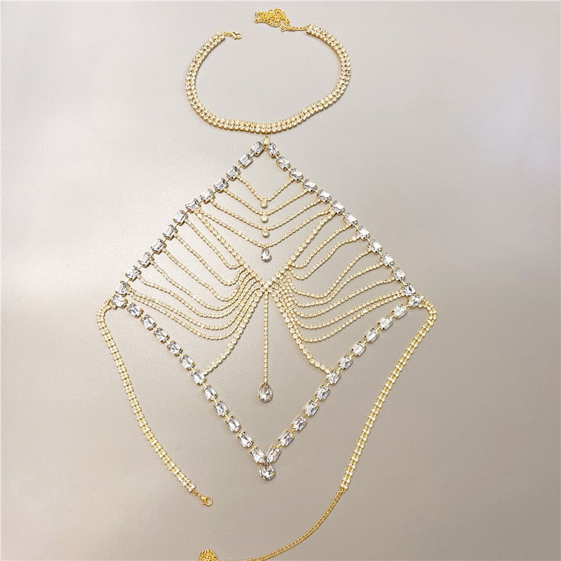 This item is perfect for the fashionista who wants to shine! Made of high-quality materials, this body jewelry is not only eye-catching but also durable. The halter top style body jewelry with a diamond-shaped copper chain design adorned with rhinestones is a must-have piece to add to your collection!