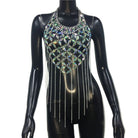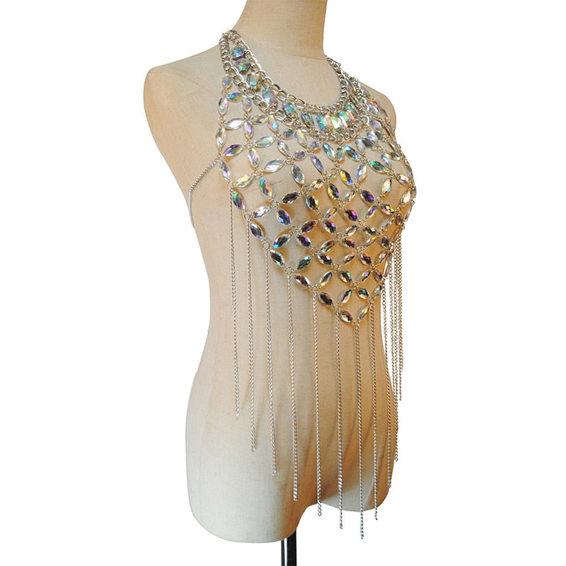 Be one step ahead of the fashionable pack with thise body jewelry! This backless halter top style body jewelry turns heads, featuring acrylic beads and chain tassels that'll make them do a double take. Accessorize like a boss and stand out from the crowd!