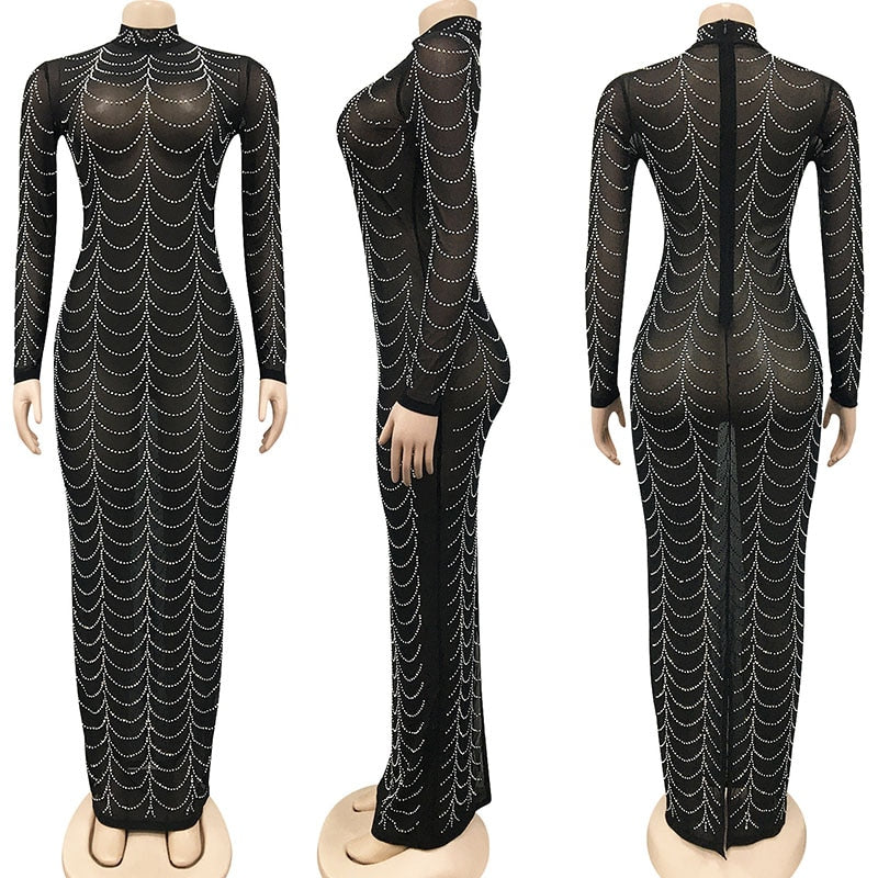 Expect to feel and look classy in this beautiful floor-length dress. The glamorous rhinestone detailing brings out the beauty in your look, while the sheer mesh fabric adds a touch of sexiness. This luxurious dress is the perfect way to show off your figure in a dress that will put you in a good mood.