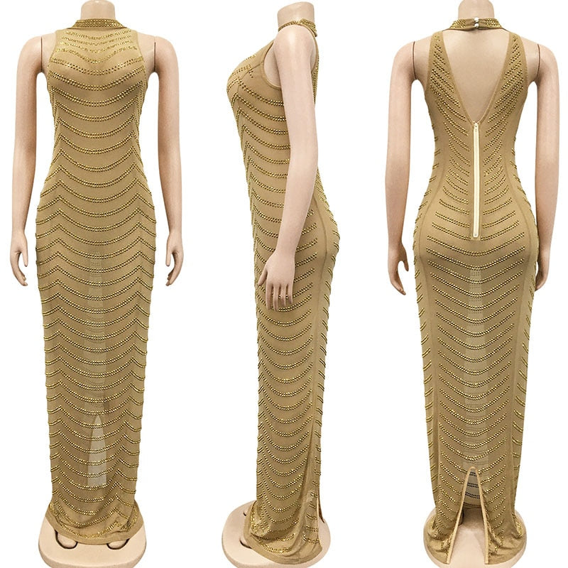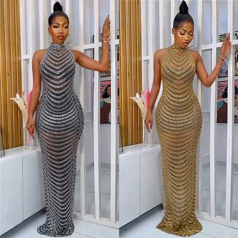 This gorgeous floor-length dress has a halter neck, sleeveless design, and high-quality rhinestone design. It comes in a variety of bright and bold shades of pink and purple. The comfortable and flowy design is perfect for a night out on the town. This dress is sure to turn heads and make a statement.