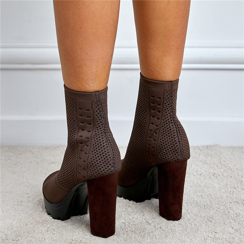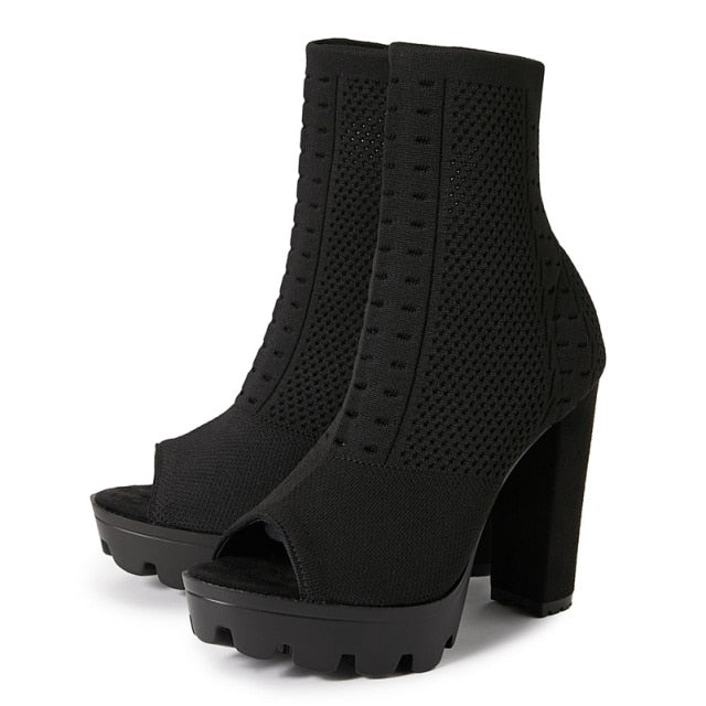 Stay warm with these knitted ankle boots. The stretchy fabric will fit your feet like a glove and feel very comfortable. The peep-toe design is perfect for a chill sunny day. The basic color makes it easy to pair with your favorite outfits.
