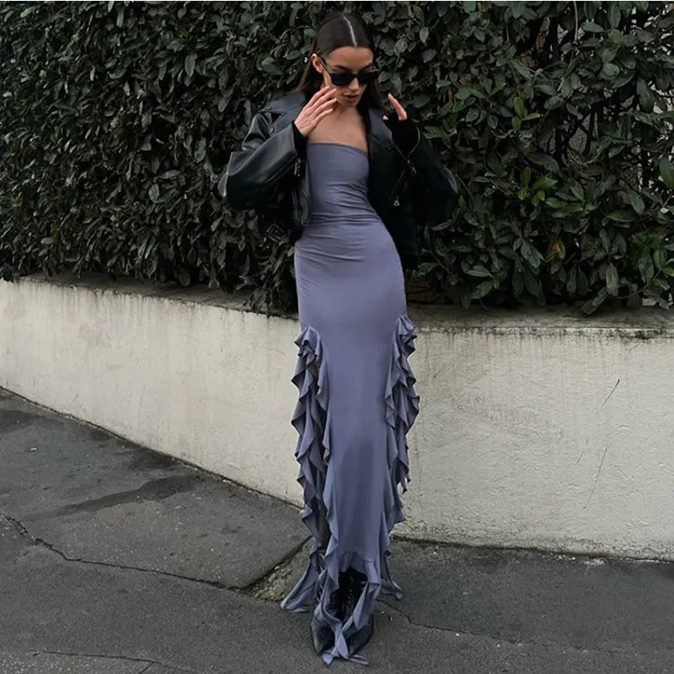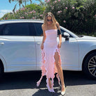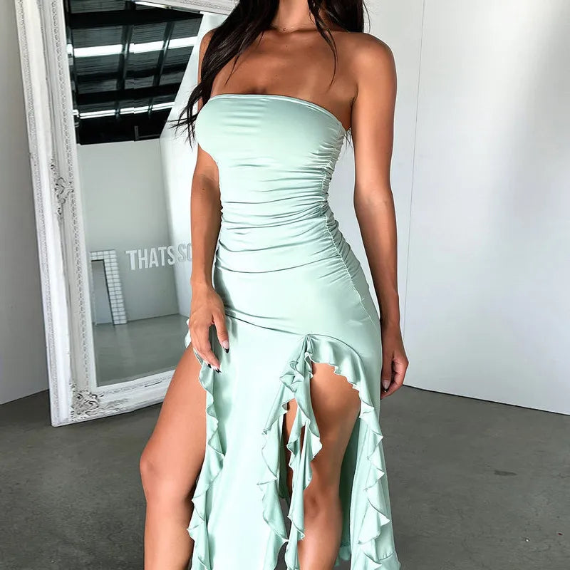 This slim-fitting sheath dress features a strapless neckline and elegant ruffle detailing. Made of high-quality polyester, it boasts a solid pattern and sleeveless design. Perfect for any occasion, this midi dress will be a stylish and versatile addition to your wardrobe.