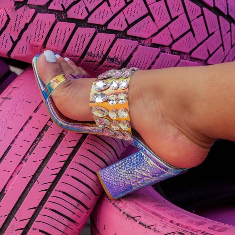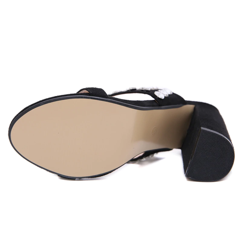 Flock Heeled Slip-On Sandal with Rhinestone Decoration