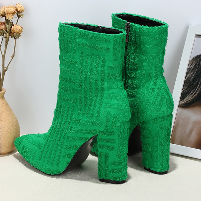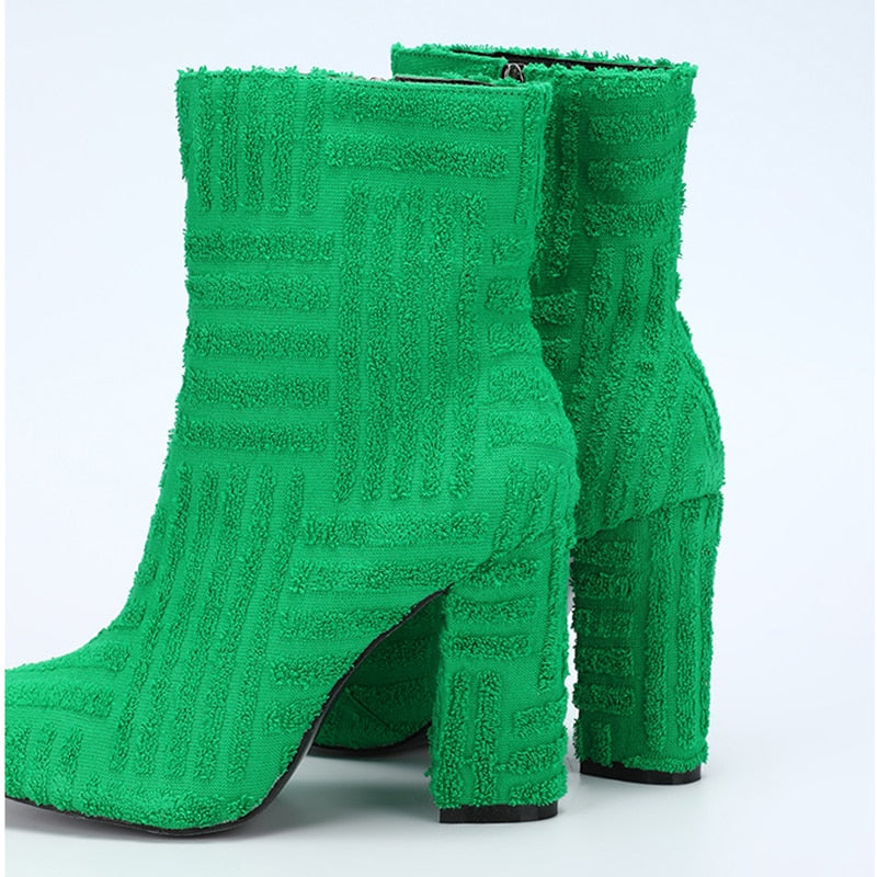 These women's boots are made of canvas and feature a zipper closure, which makes it easy to get in and out of the boots. They are a mid-calf height and has green color.