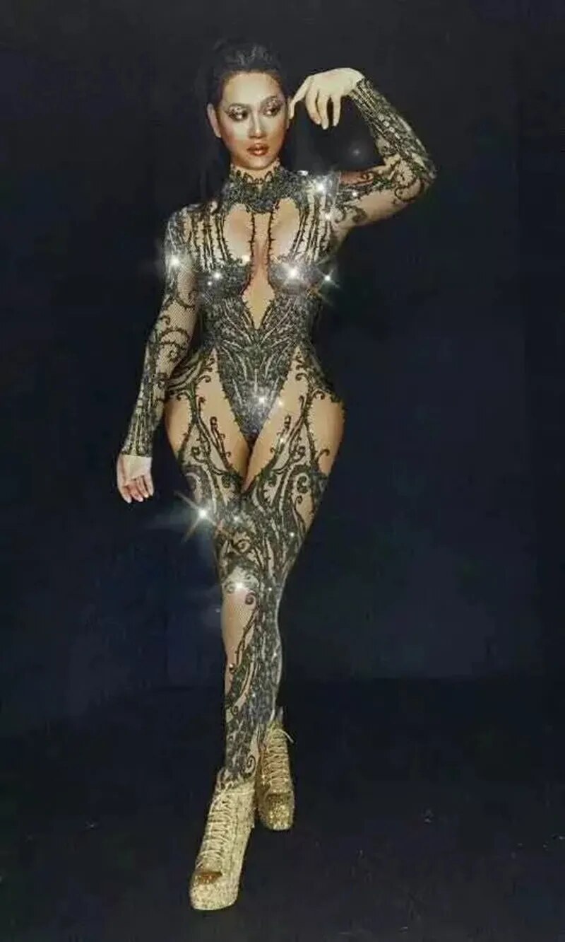 Look stylish and feel comfortable in the I Will Stuck In Your Head Jumpsuit. This jumpsuit is made of spandex and is full-sleeved for maximum coverage. The geometric pattern has been perfectly complemented with beads and lace embellishments for an eye-catching look.