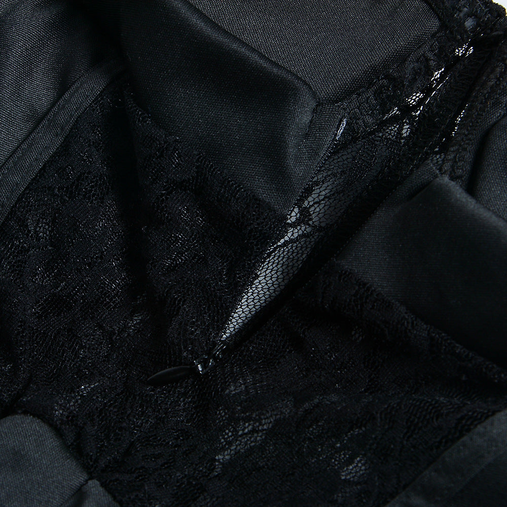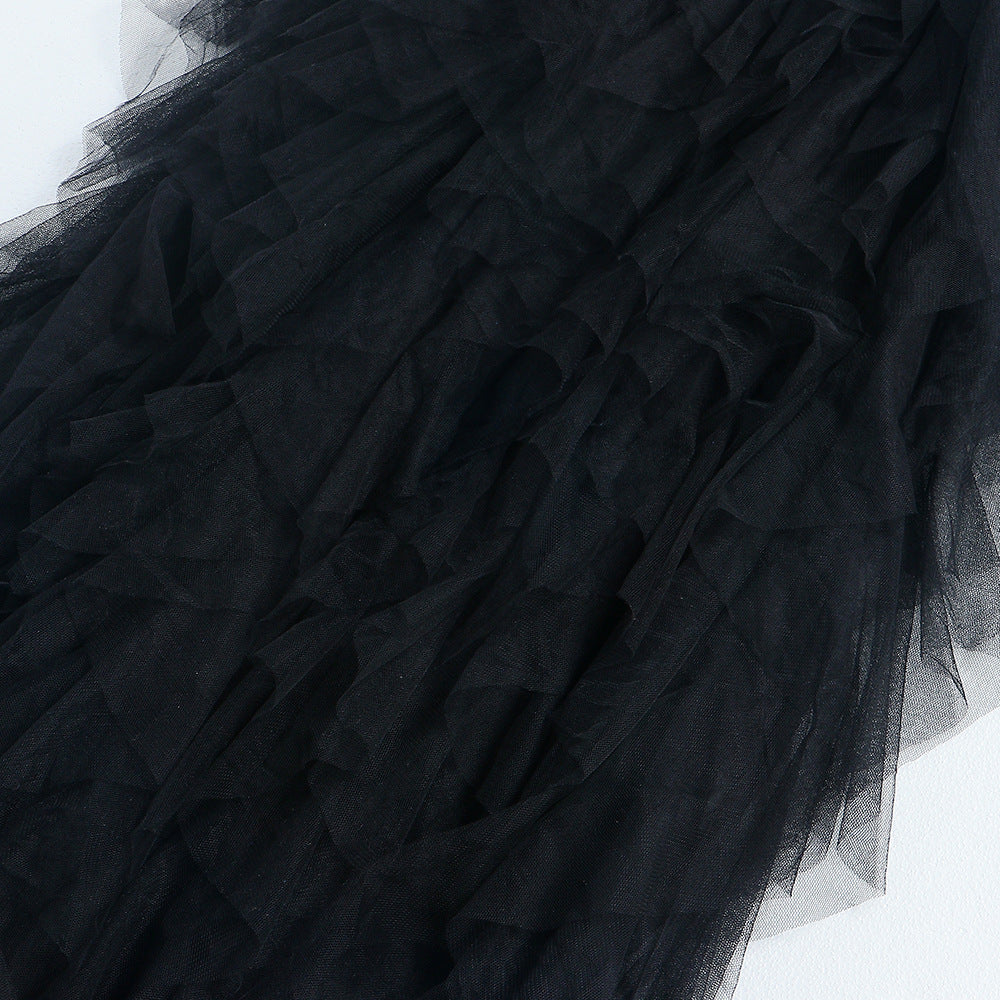 The perfect dress for a night out, this long dress is a strapless fit and flare style with a lace bodice and gauze decoration. The flowing gauze skirt has a see-through effect, perfect for showing off your stunning new heels.