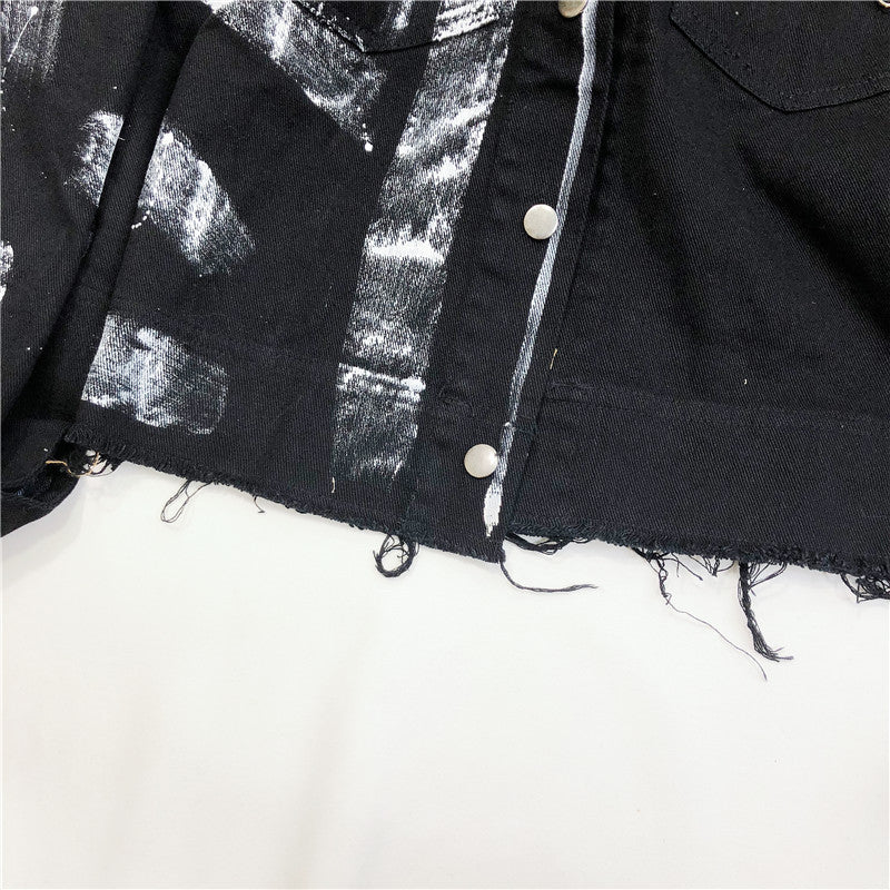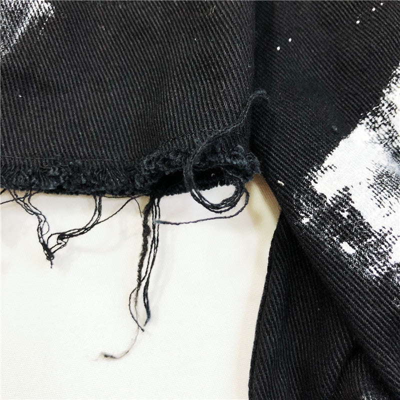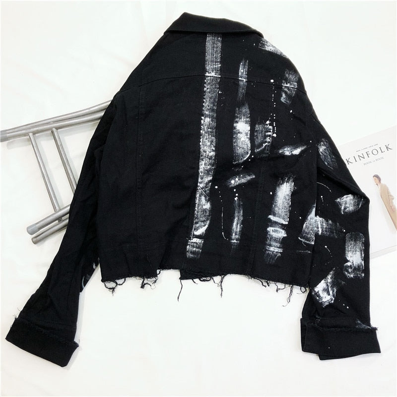 This jacket is made from a blend of viscose and cotton. It features a contrast pattern of white that includes a large abstract white and letter print. The contrast on black gives a simple street style.
