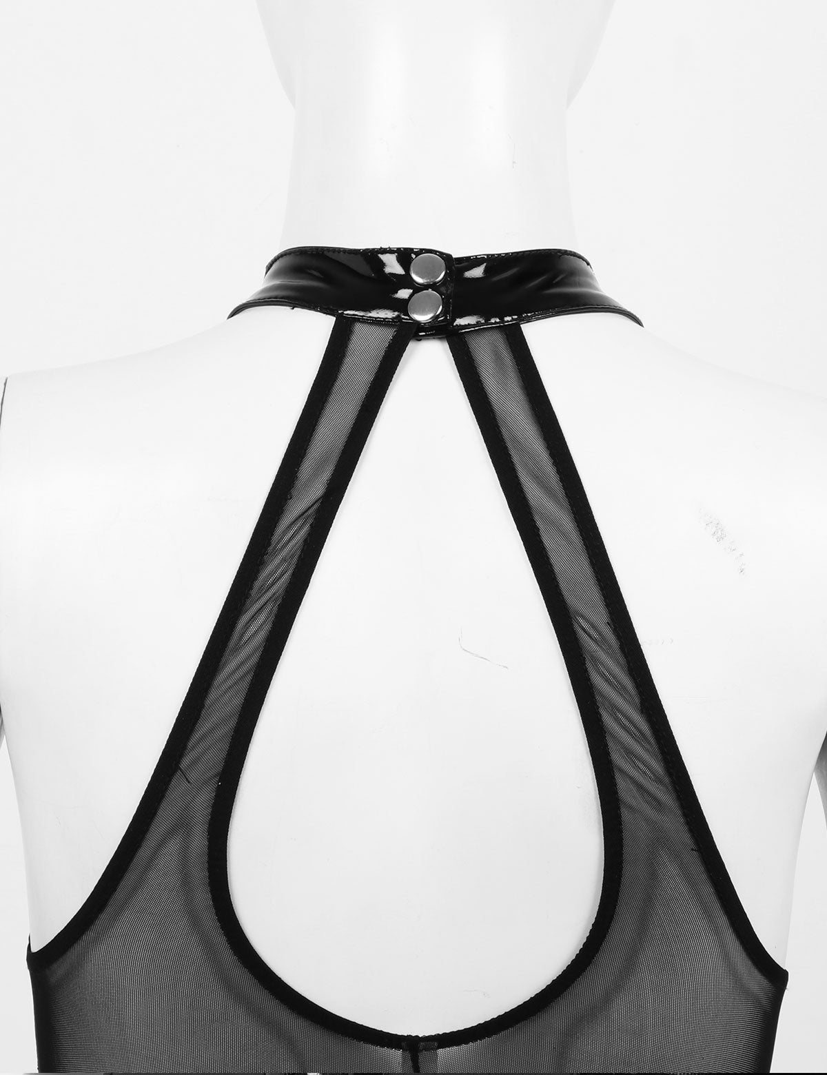 Sleeveless Mesh Black Polyester Bodysuit with Zipper Closure and Button Decoration
