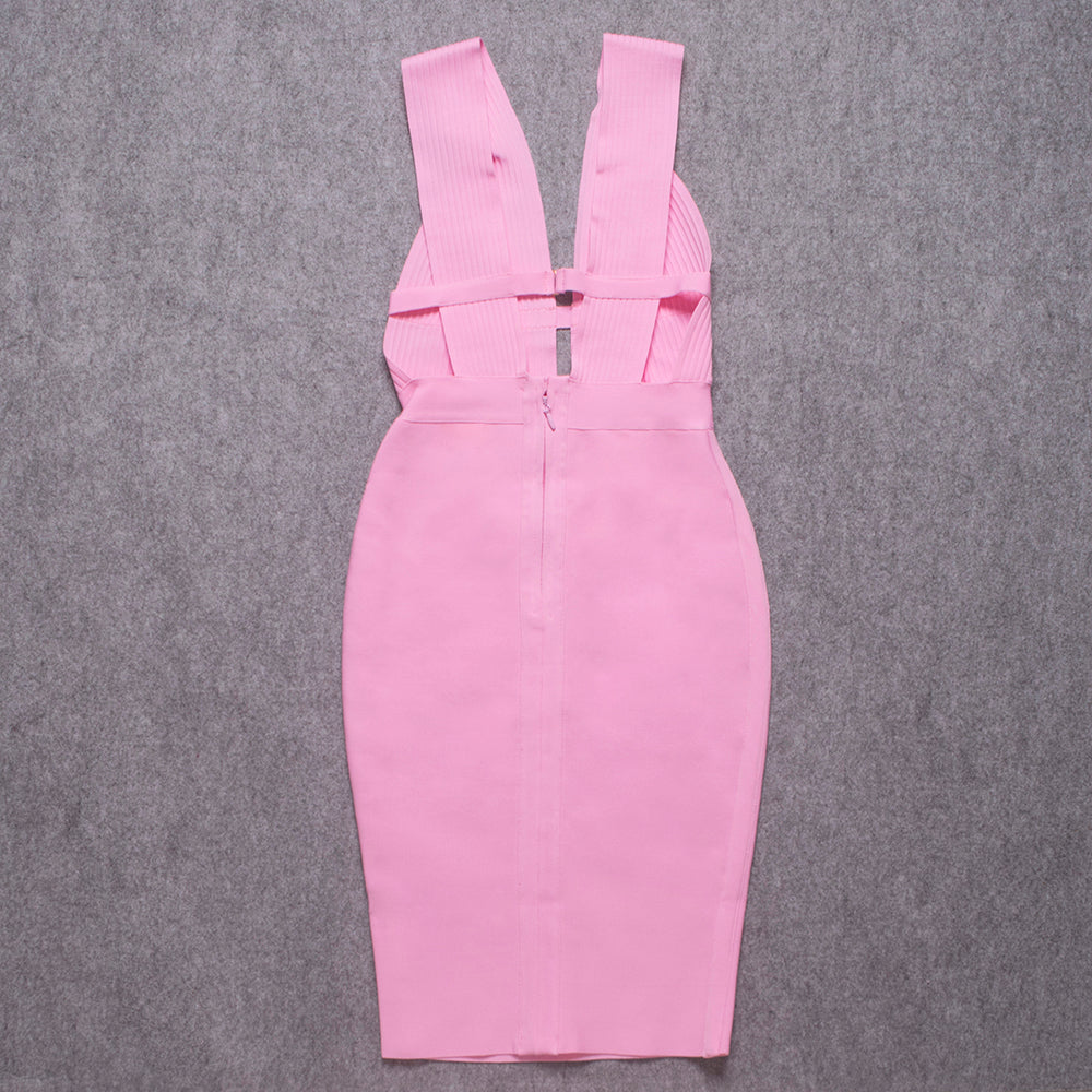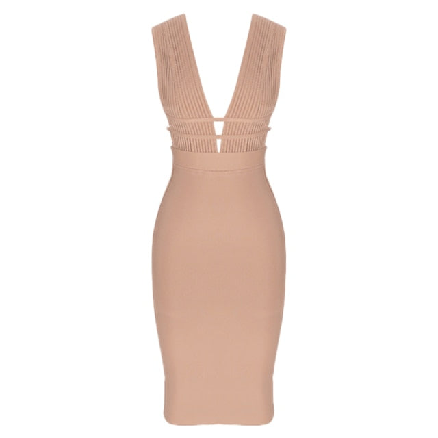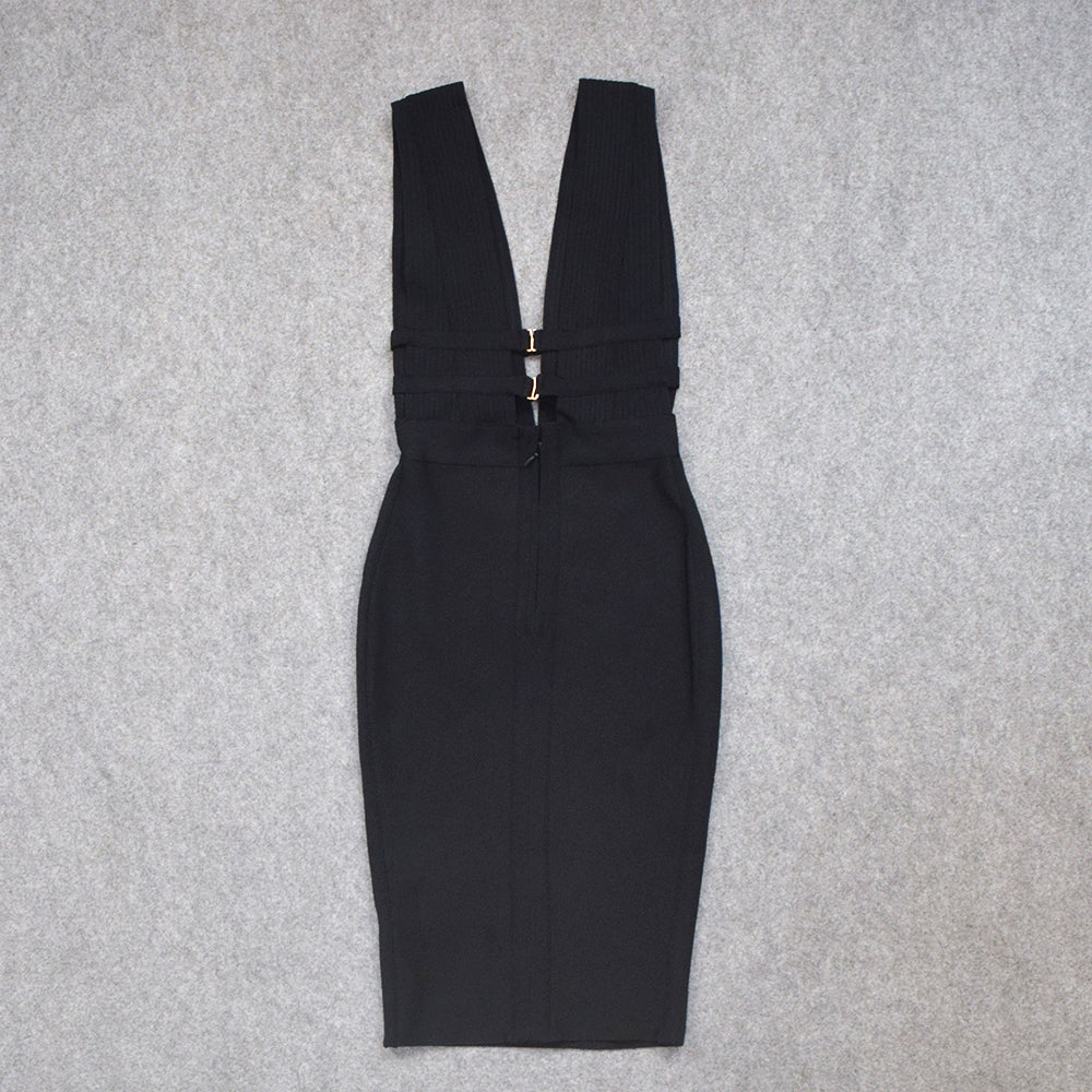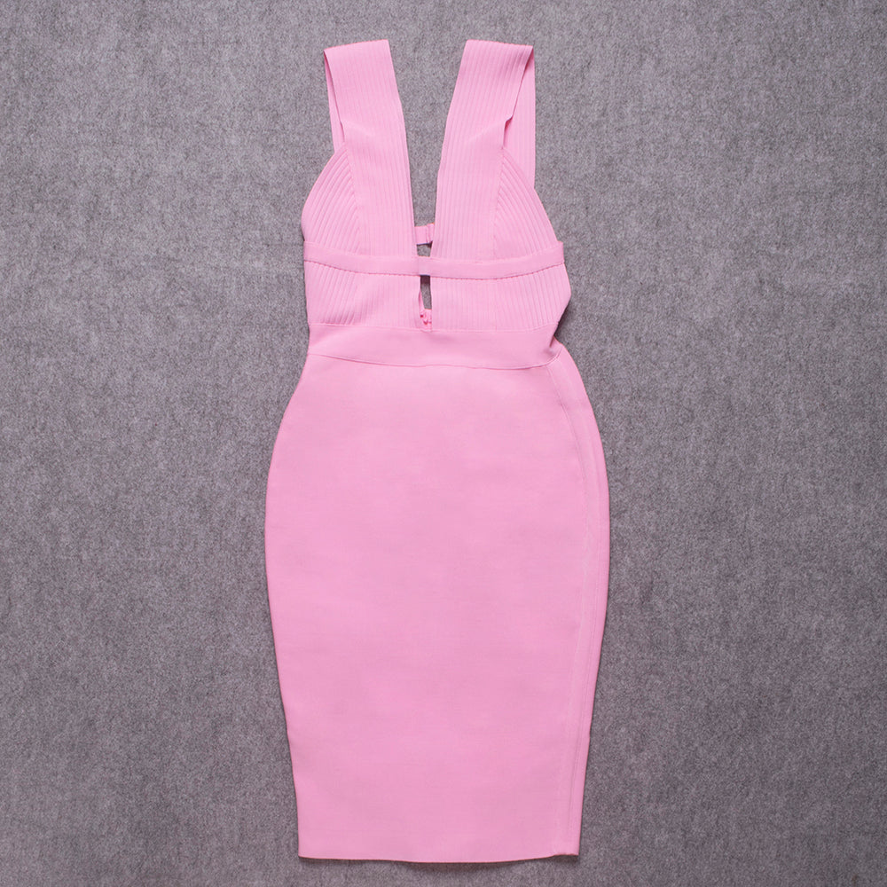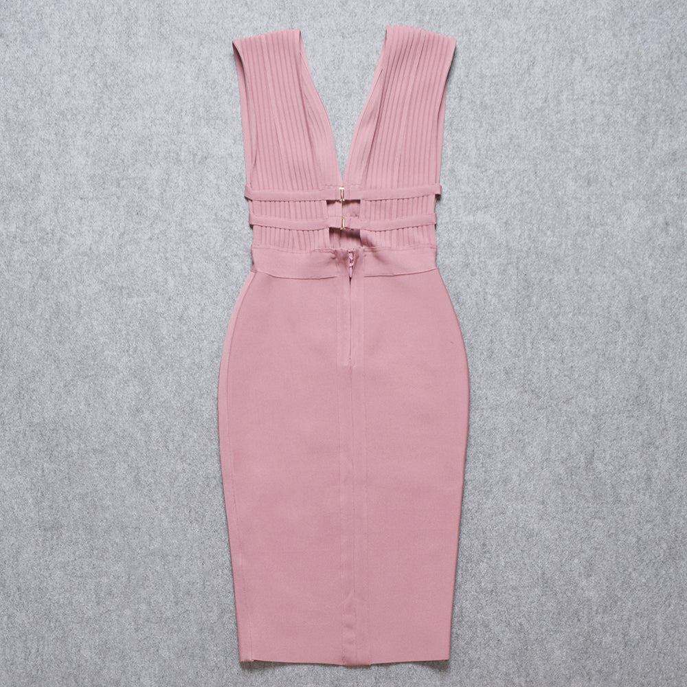 Sleeveless V-Neck Nylon Midi Dress with Hollow Out and Stripe Band Features