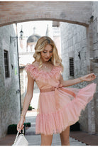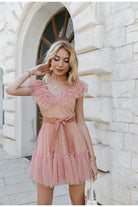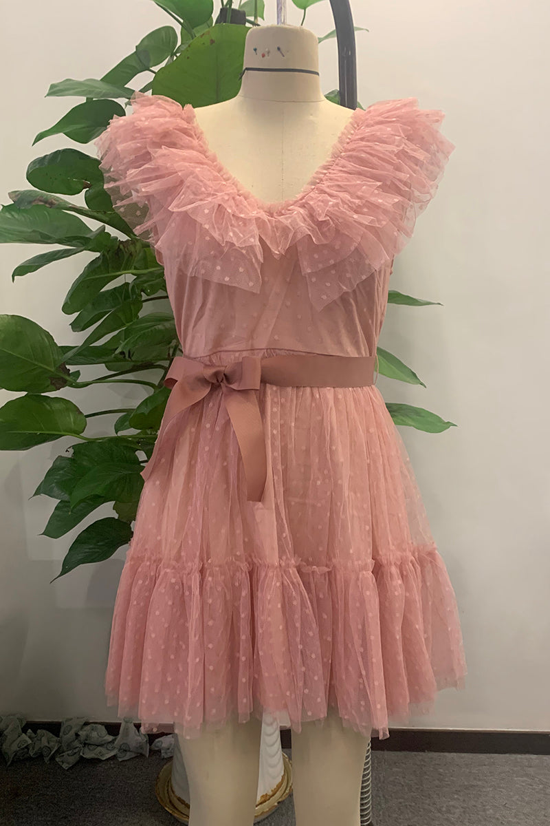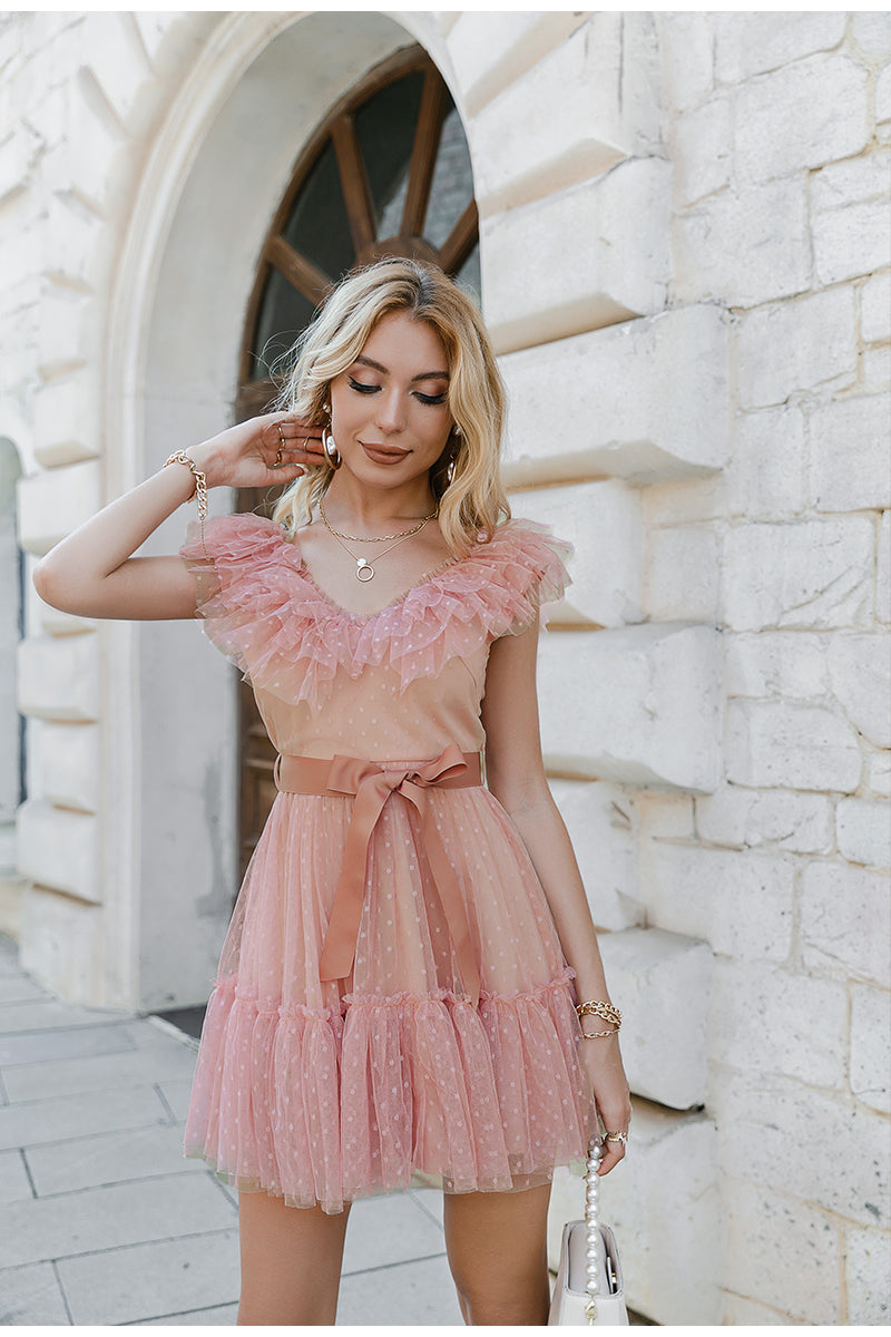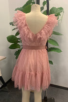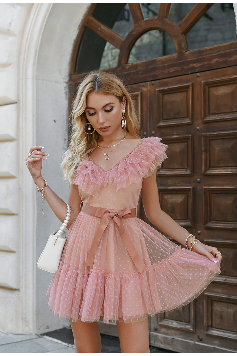 Looking for a new dress to wear this spring? This simple but stylish mini dress with ruffles at the neckline will surely give you many compliments. The elegant polka dot pattern is great for any occasion. A simple design that can be worn with anything, this dress will make her feel confident and fashionable. This dress has a cute butterfly sleeve that looks great with any heels.