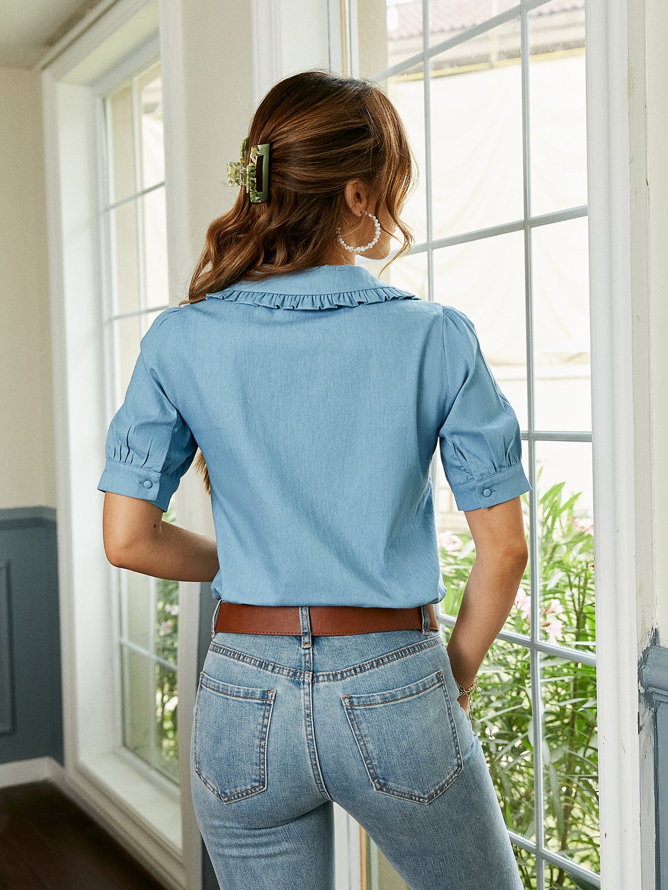 This blue denim blouse is perfect for a casual summer outfit. The Peter Pan collar and florals are a lovely accent to the blue color. It has short sleeves and button-up detail. The cotton material is soft and comfortable.