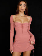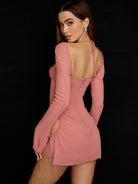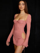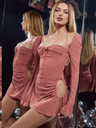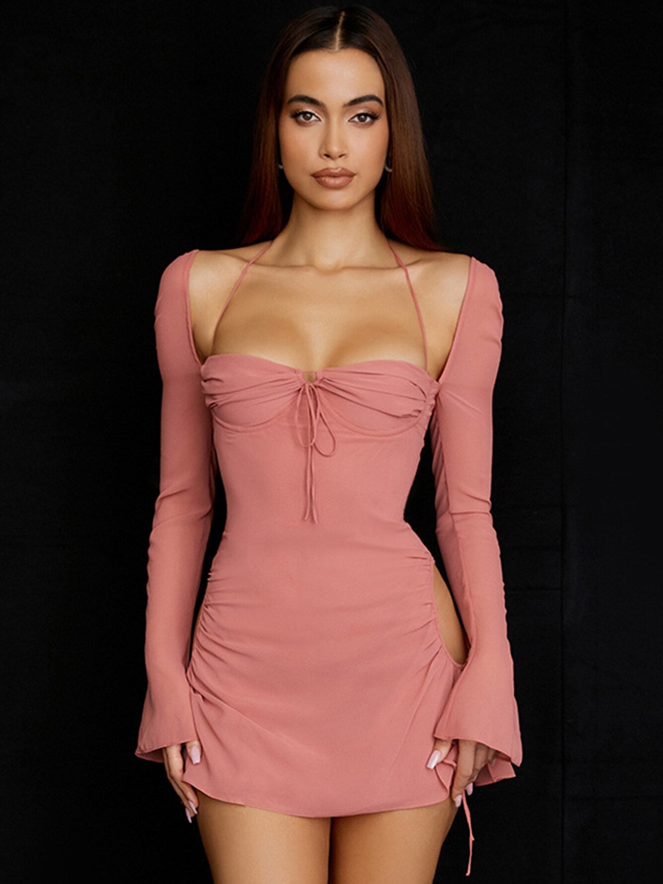 Soo gorgeous! This mini dress is a must-have item in your wardrobe. Features halter strap and hollow-out design on the side of the clothes. This mini dress has a long sleeve but you can still show off your figure cause it has a slit and square neckline.
