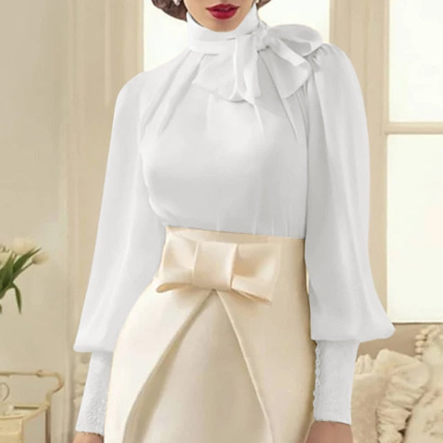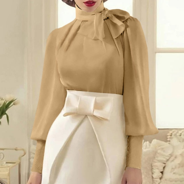 Fitted and stylish, this women's blouse is a perfect choice for any occasion. A flattering stand collar and bow decoration on the neckline create a feminine look. This full-sleeved shirt is dressed up in a stunning luster on an elegant background. This blouse is sure to become a staple in any wardrobe. This women's blouse is crafted with a lightweight and comfortable polyester fabric.