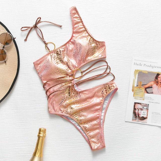 Animal Patterned Polyester Spandex Bikini with Unique One-Shoulder Strap Style