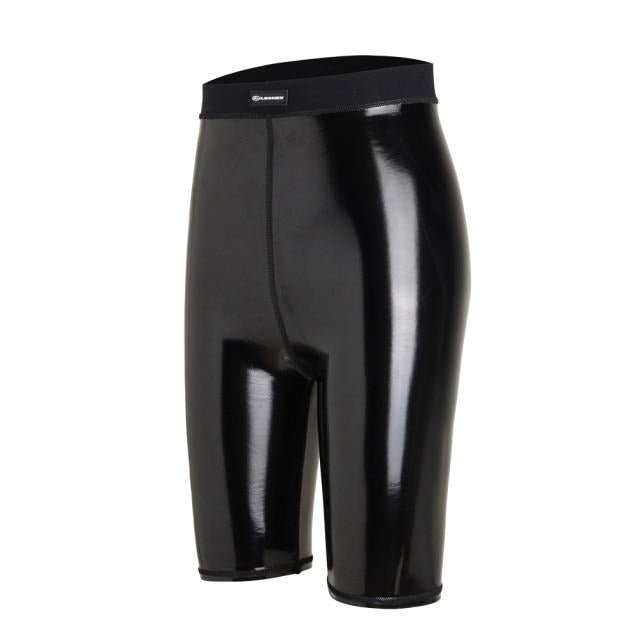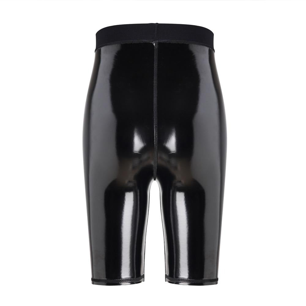 Looking sharp is easy with these stylish and trendy shorts that are great for the summer season. The black material has a glossy look that is sure to become a staple feature in any trendy wardrobe.