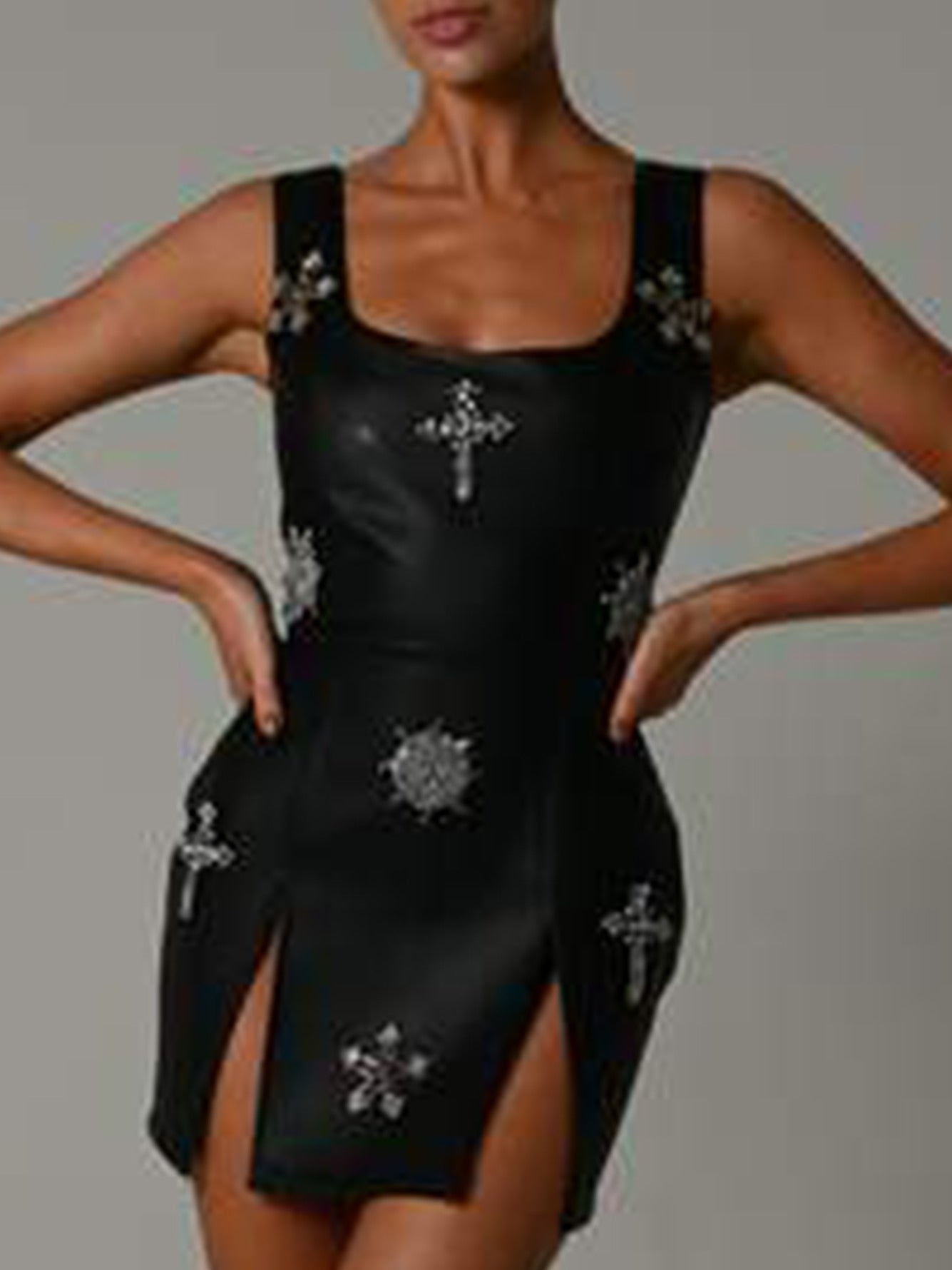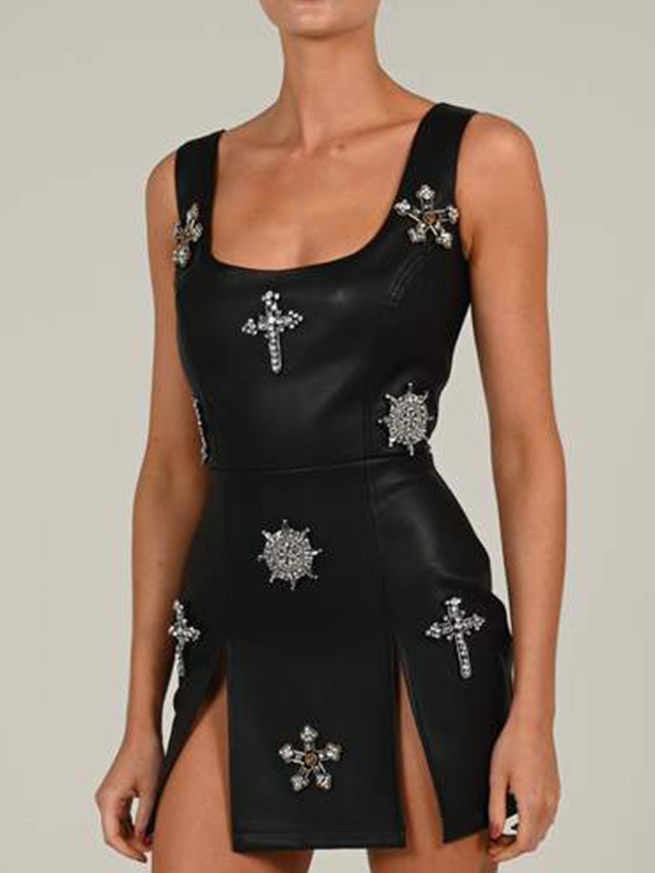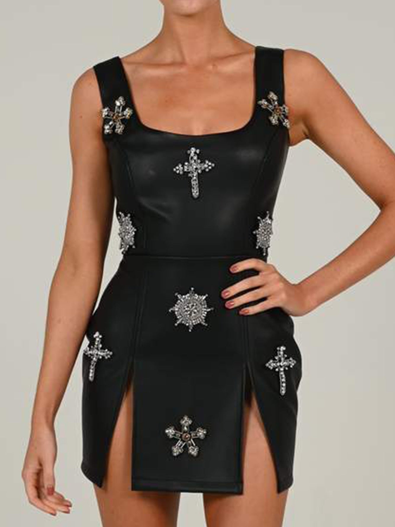 The perfect outfit to choose for a night on the town. The black solid color with metal appliques makes it the perfect choice for any occasion. The flattering square neckline and sleeveless add a touch of sass to her ensemble. This piece makes a great choice for her summer wardrobe.