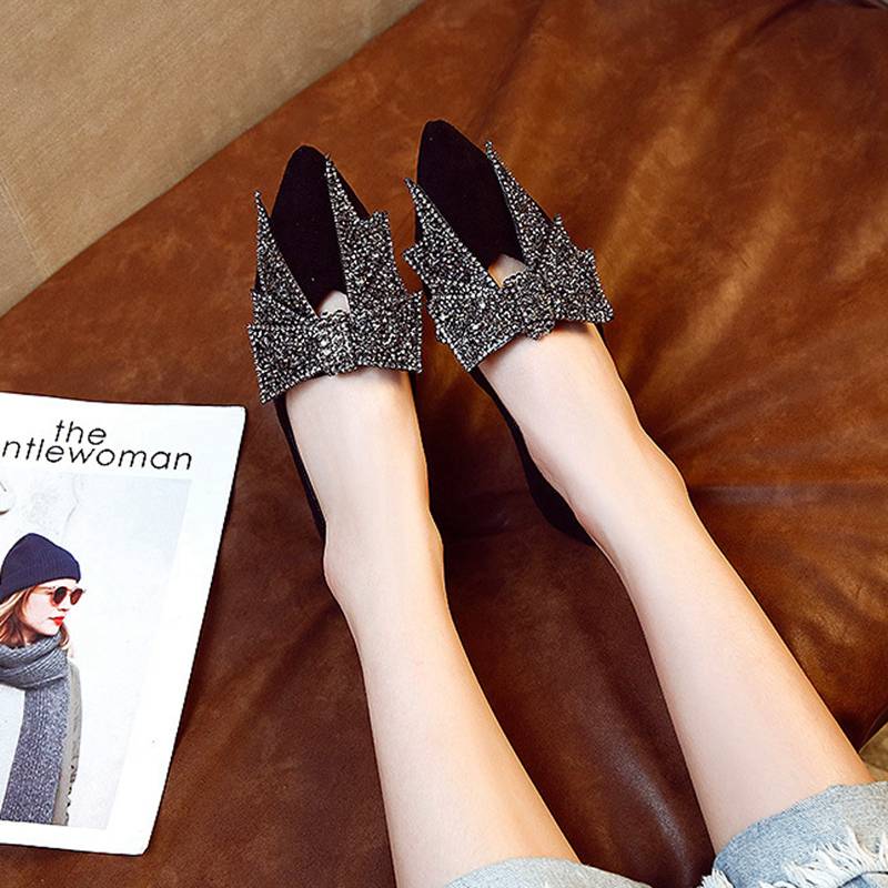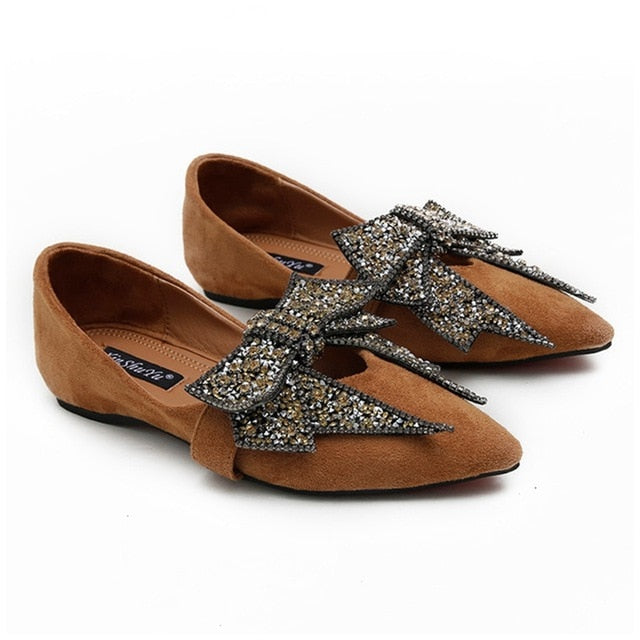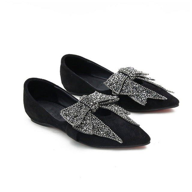 Elegant Bling Crystal Bow Tie Pointed Toe Women Flat Shoes