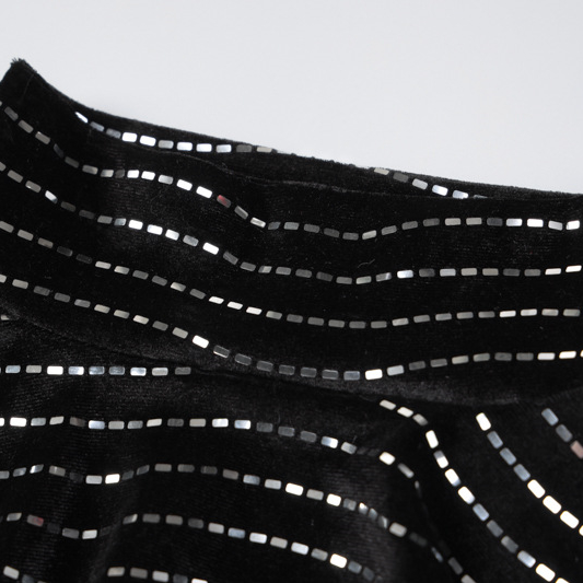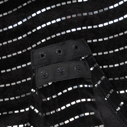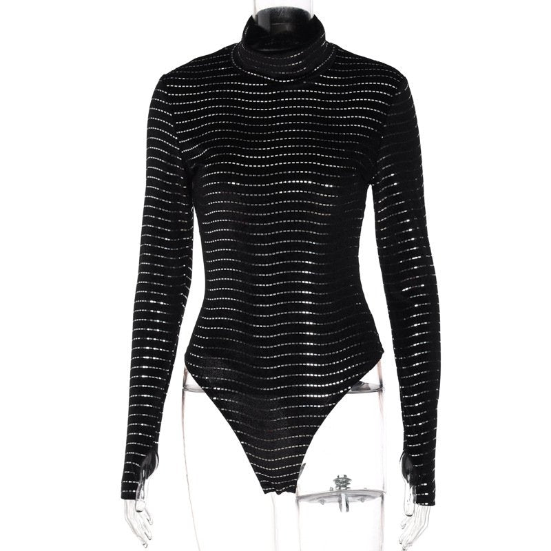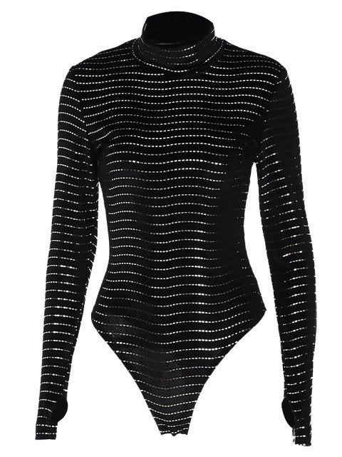 The perfect staple for any wardrobe, this long-sleeved bodysuit is made of polyester spandex blend material. It features a dramatic turtleneck and rectangular sequin design that gives it extra sparkle.