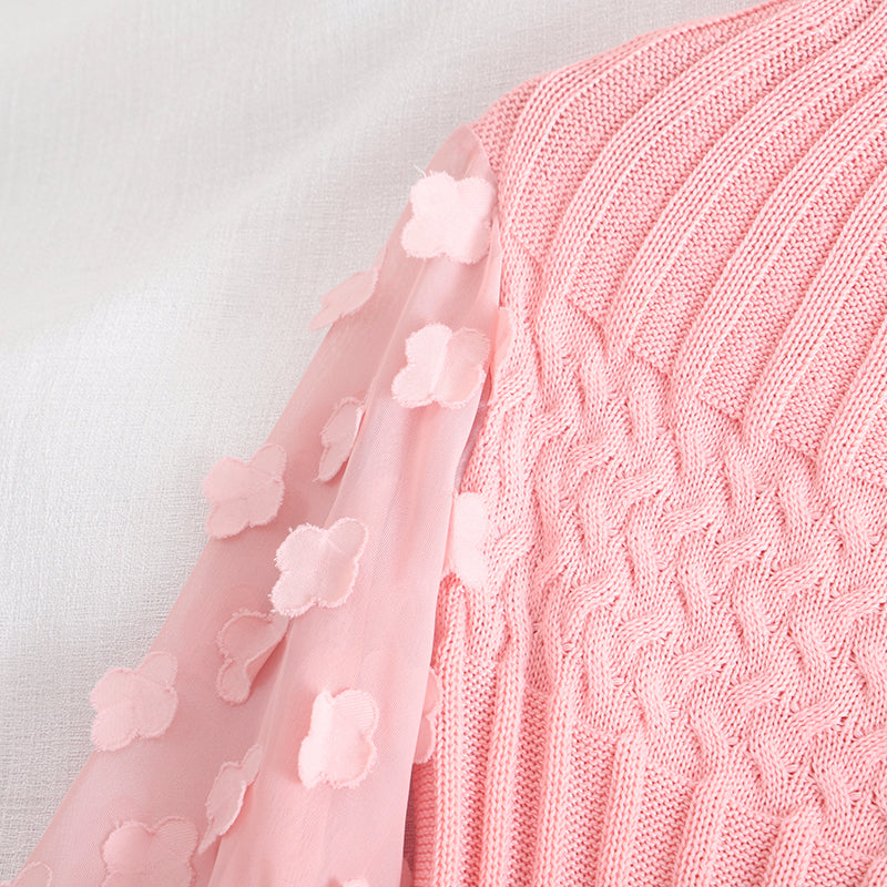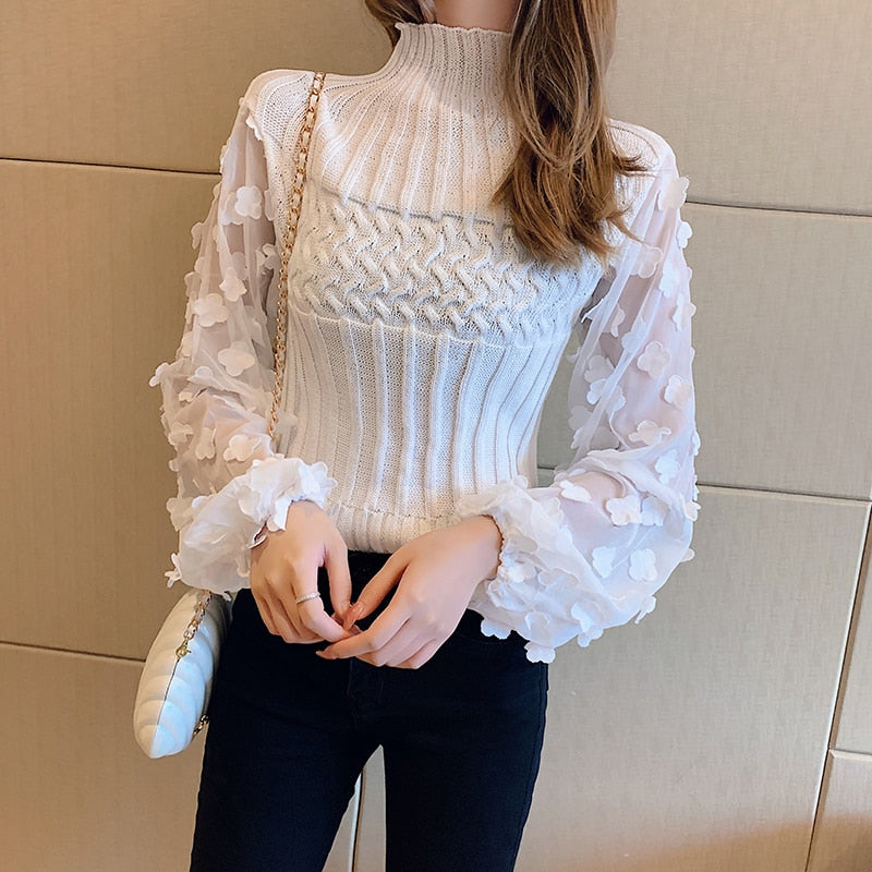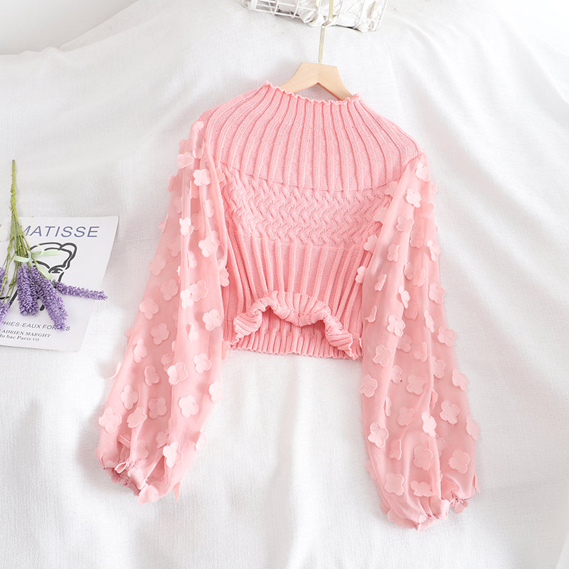 Computer Knitted Acrylic Cotton Polyester Blouse with Lantern See-Through Sleeve and Floral Appliques Decoration